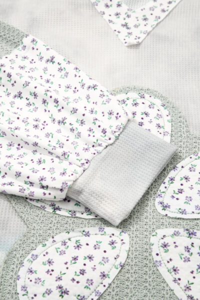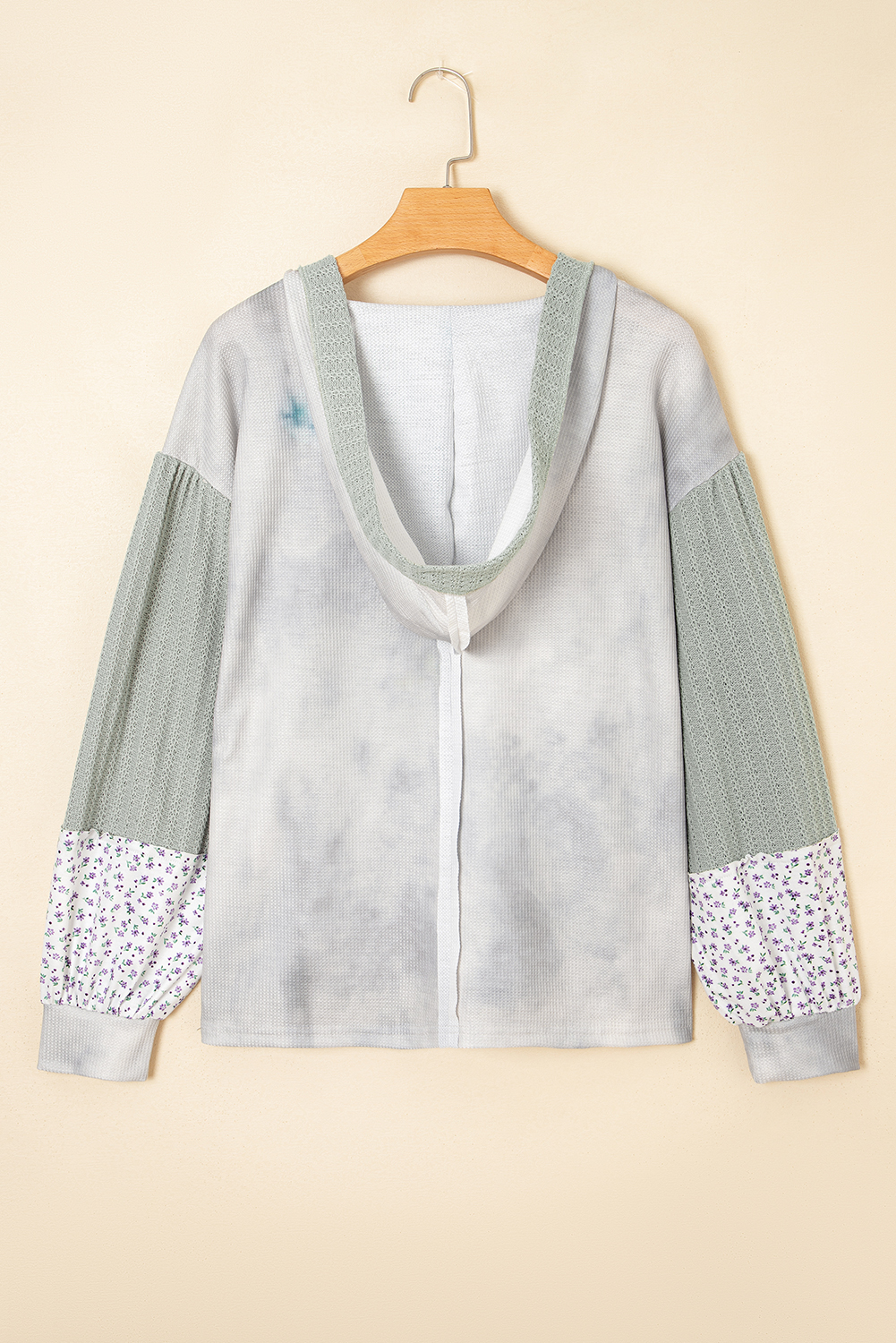 Green Floral Patched Waffle Textured Colorblock V Neck Casual Hooded Top