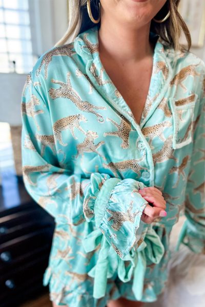 Green Leopard Satin Ruffle Pajama Short Set