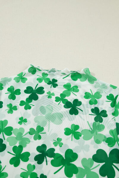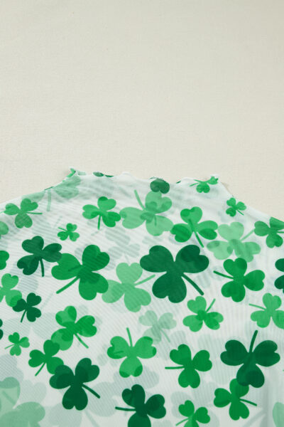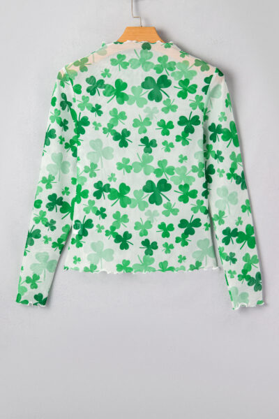 Green Lucky Shamrock Lettuce Trim High Neck Mesh Long Sleeve Top