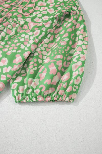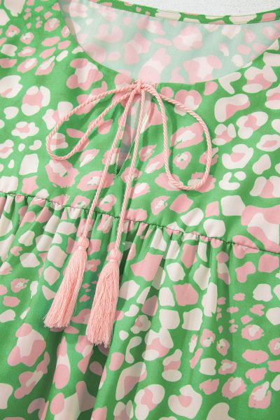 Green Plus Size Floral Tassel Tie Split Neck Puff Sleeve Blouse