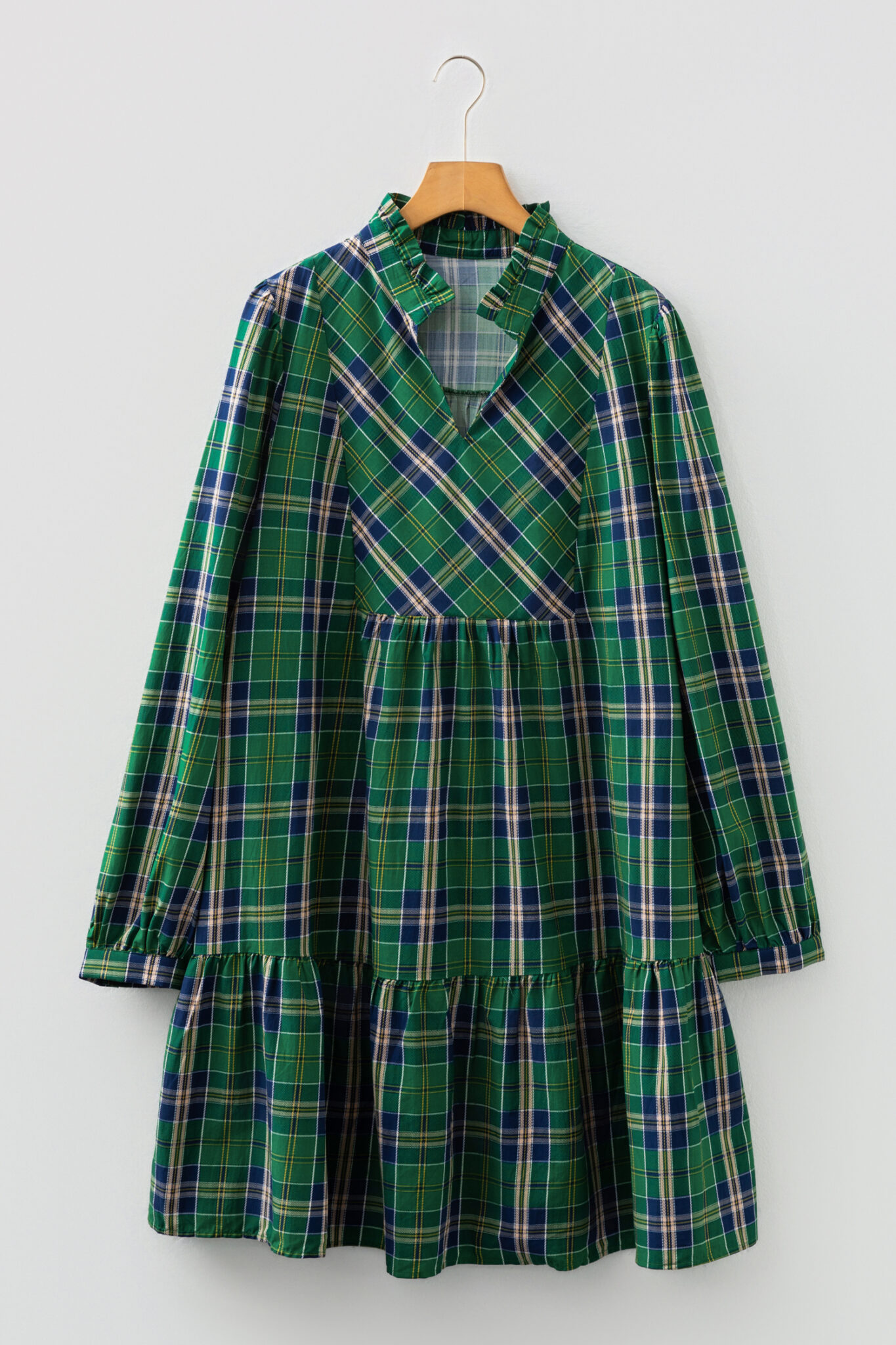 Green Plus Size Plaid Long Sleeve Notched Neck Shift Mini Dress