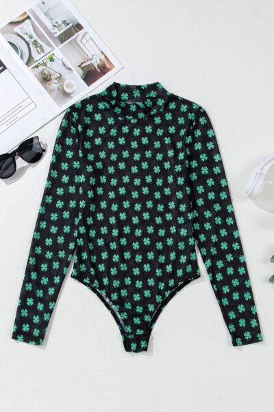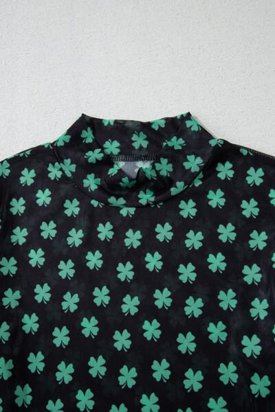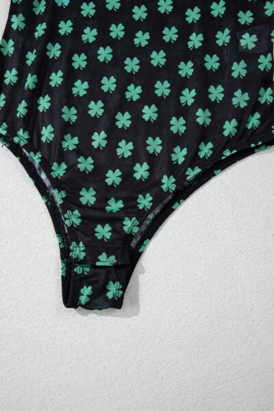 Green St Patrick Shamrock Printed Long Sleeve Mesh Bodysuit