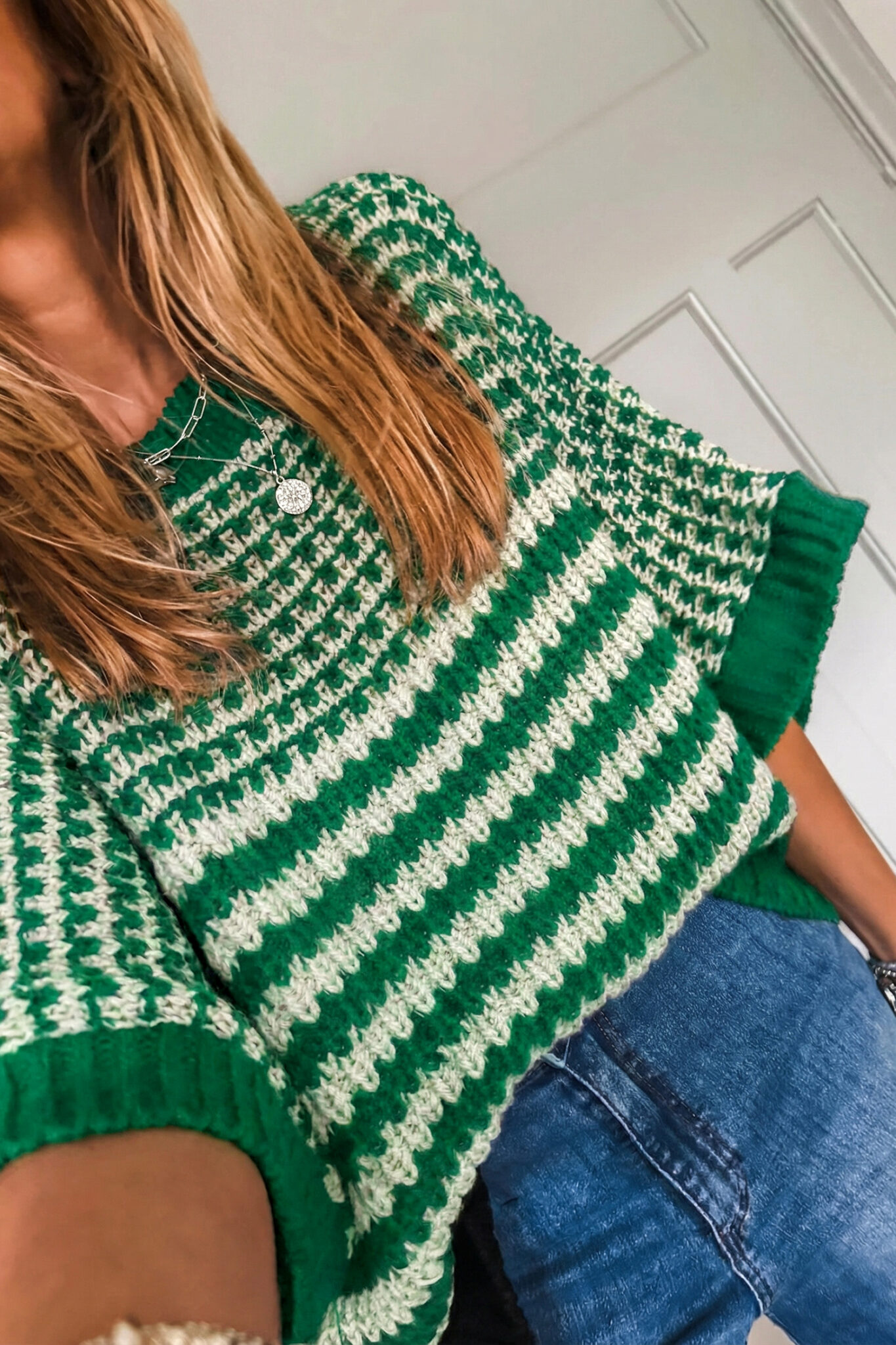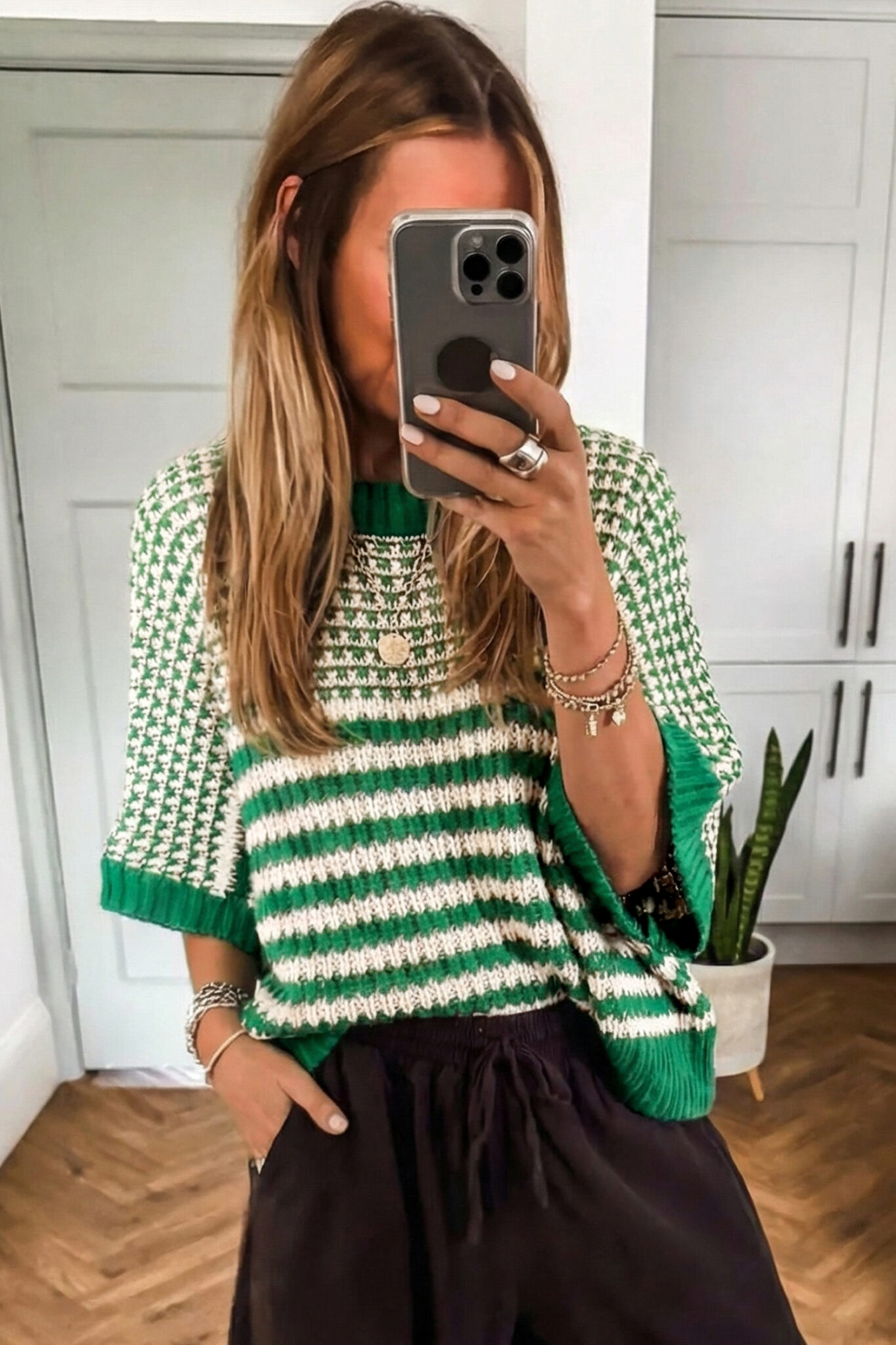 Green Stripe 3/4 Draped Sleeve Slouchy Sweater