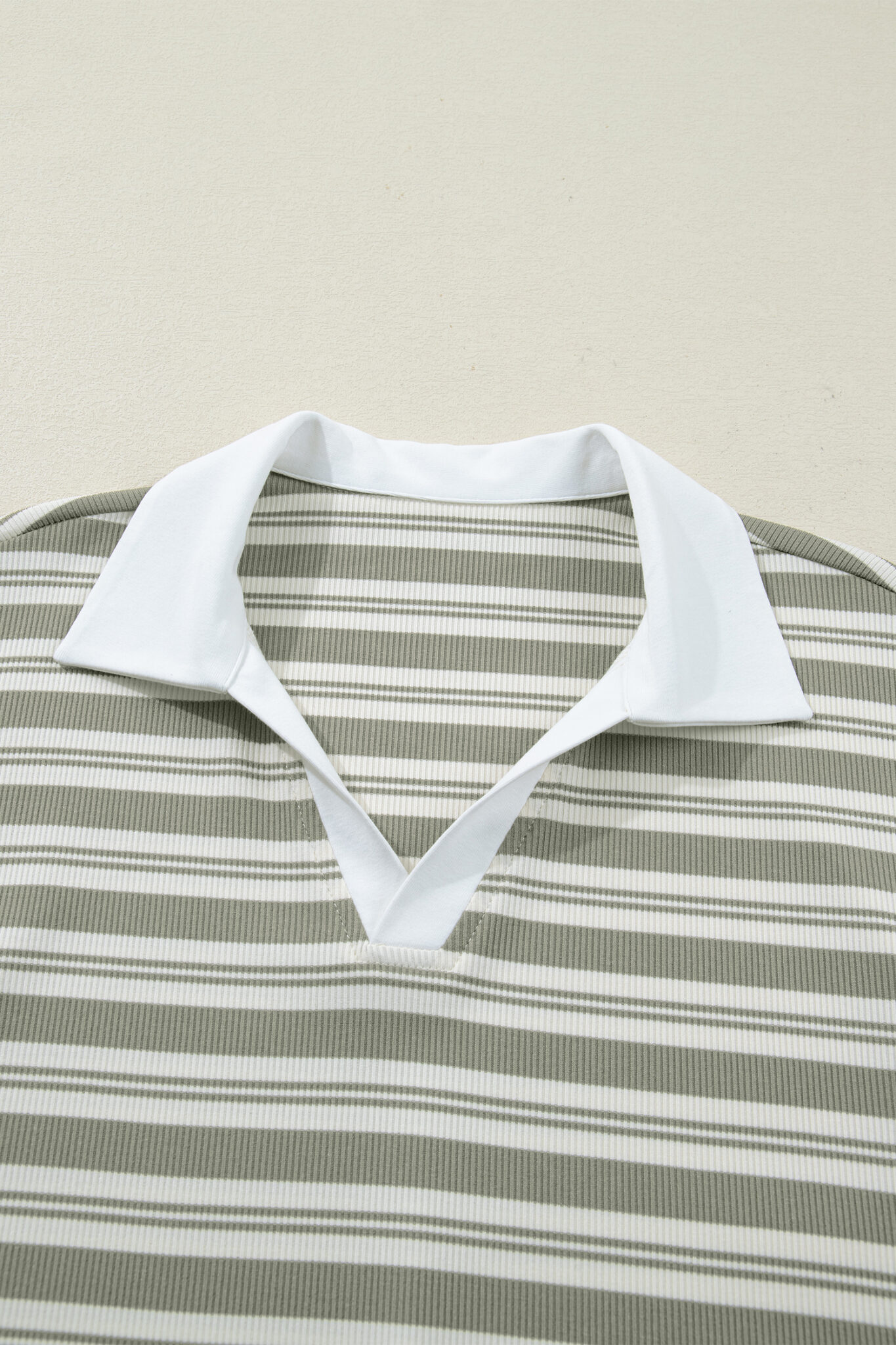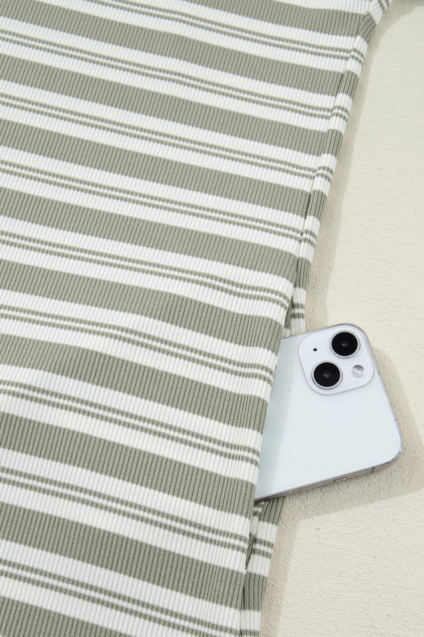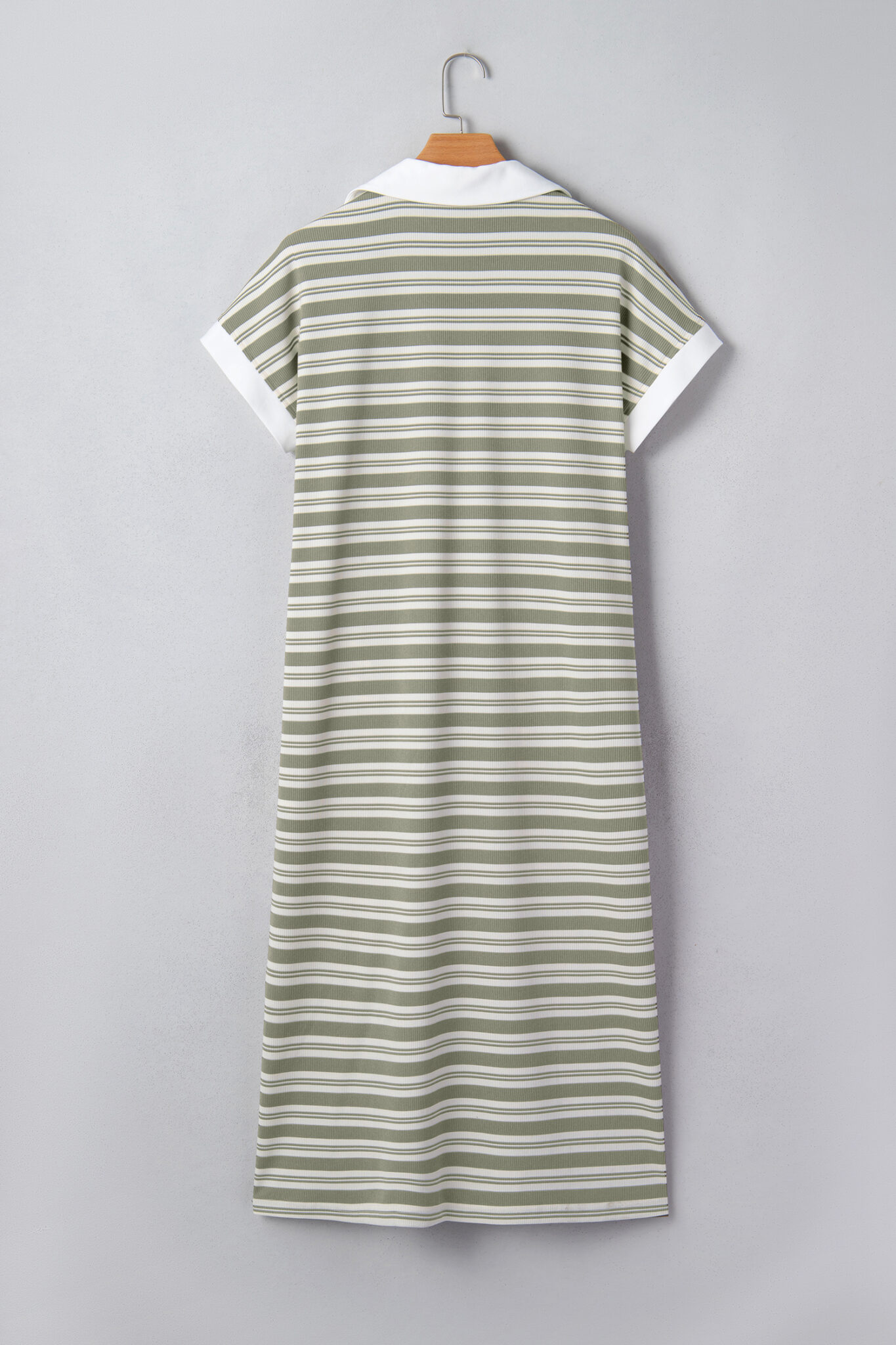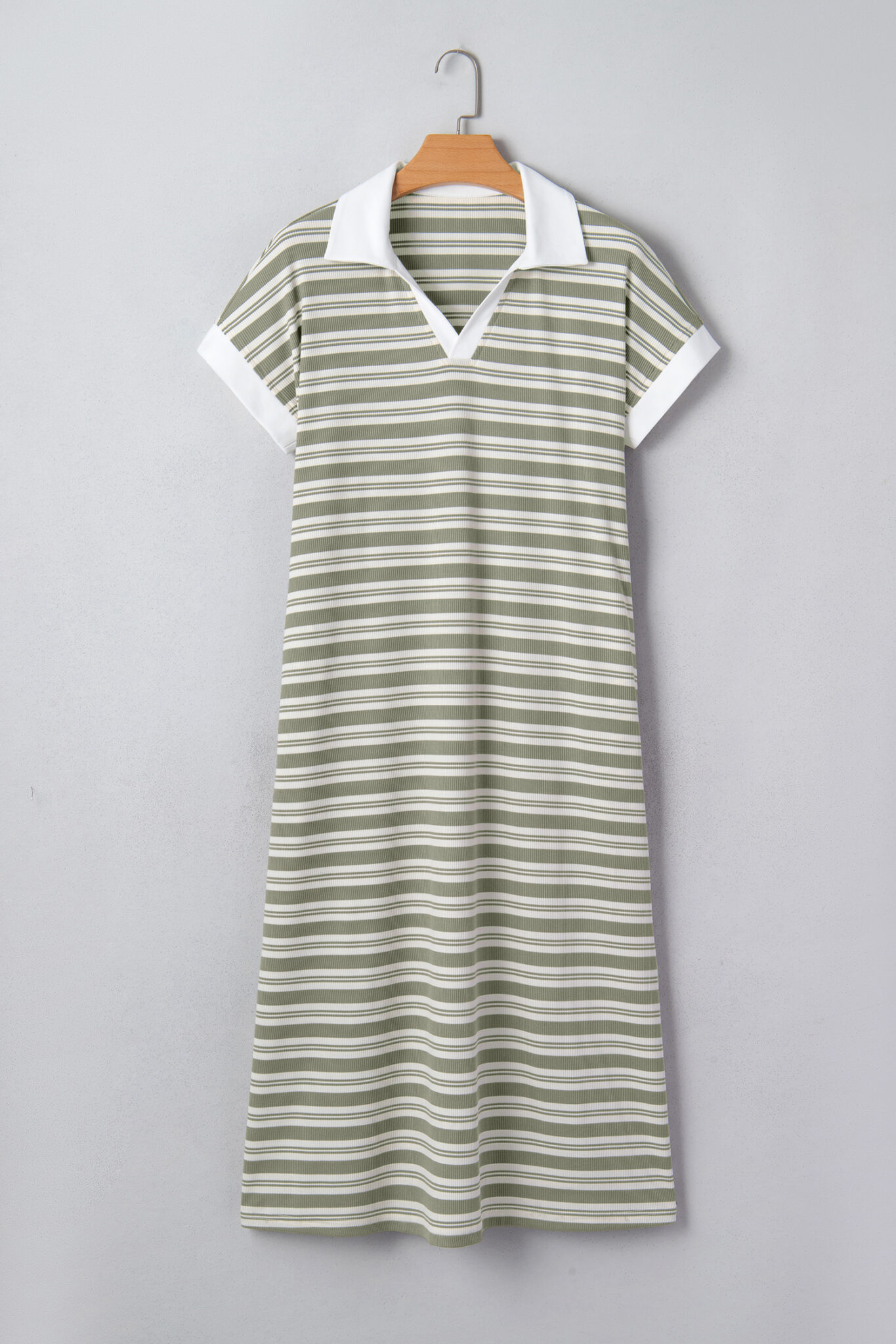 Green Stripe Collared V Neck Short Sleeve T Shirt Midi Dress with Pockets