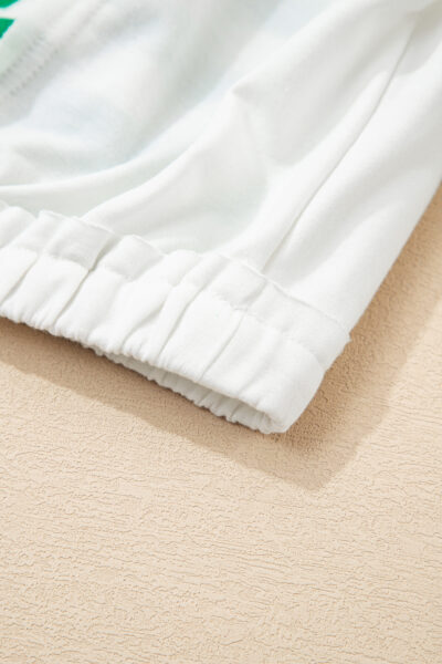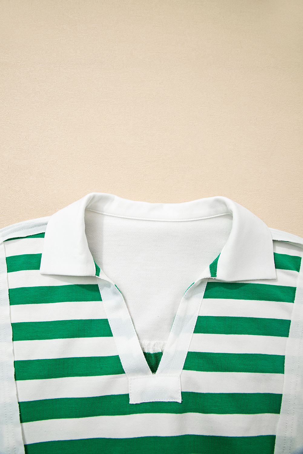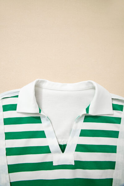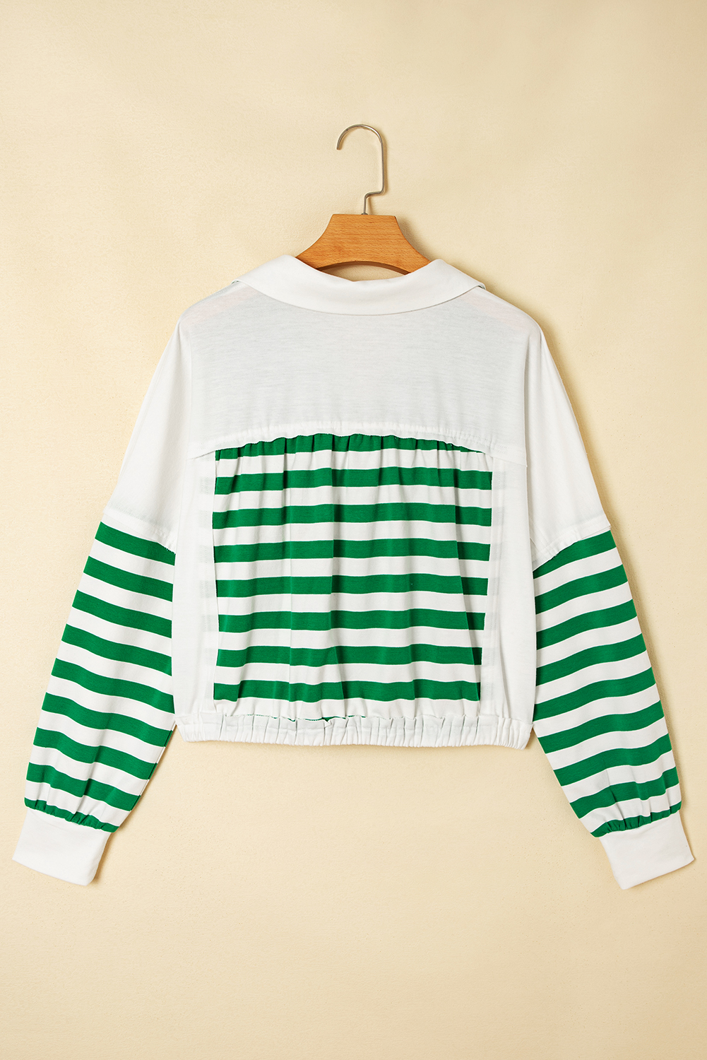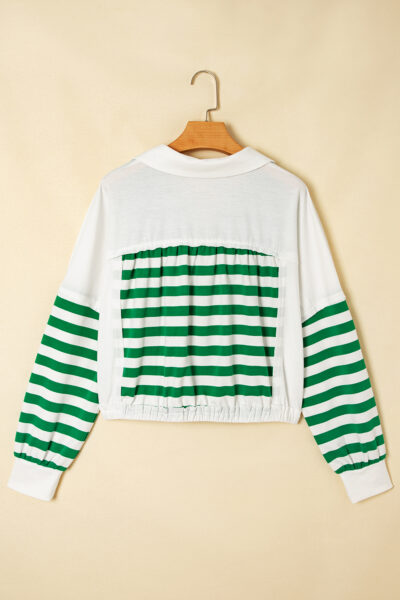 Green Stripe Colorblock Collared V Neck Cropped Knit Pullover