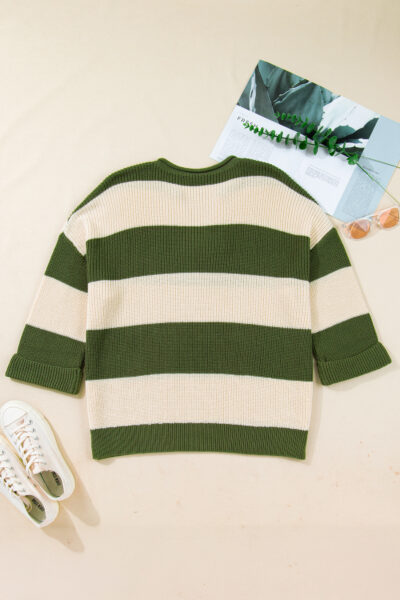 Green Stripe Colorblock Notched Neck Plus Size Sweater