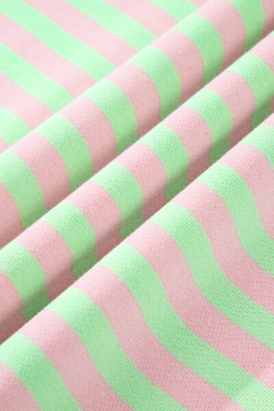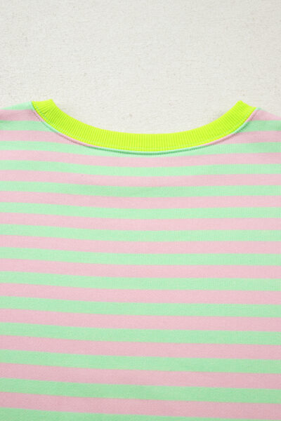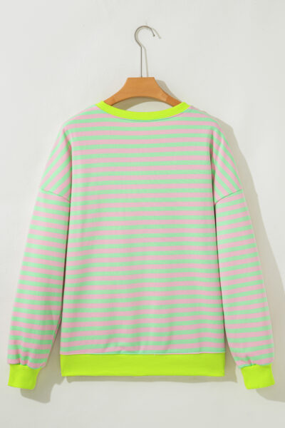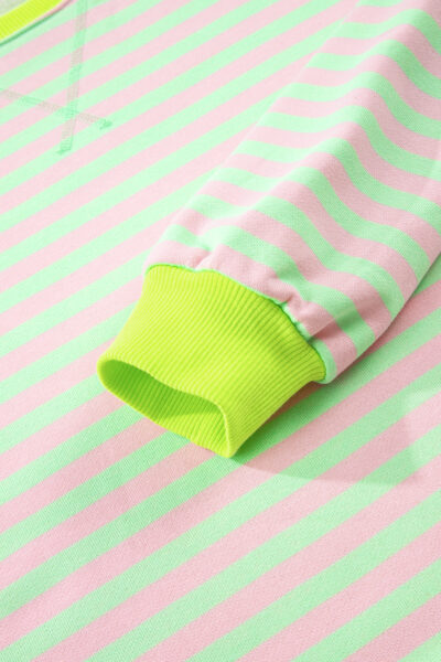 Green Stripe Contrast Ribbed Trim Crossed Stitch Drop Shoulder Sweatshirt