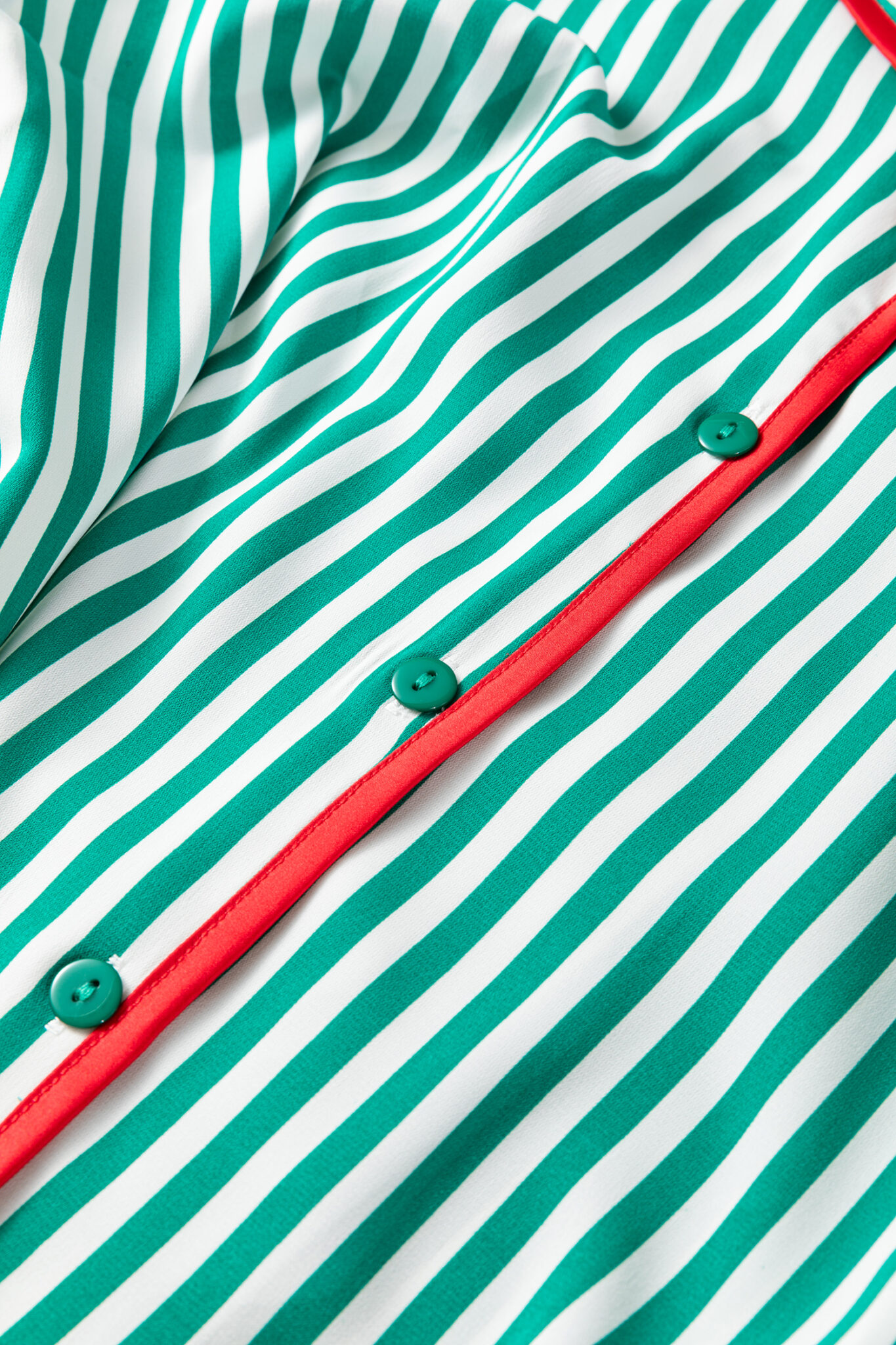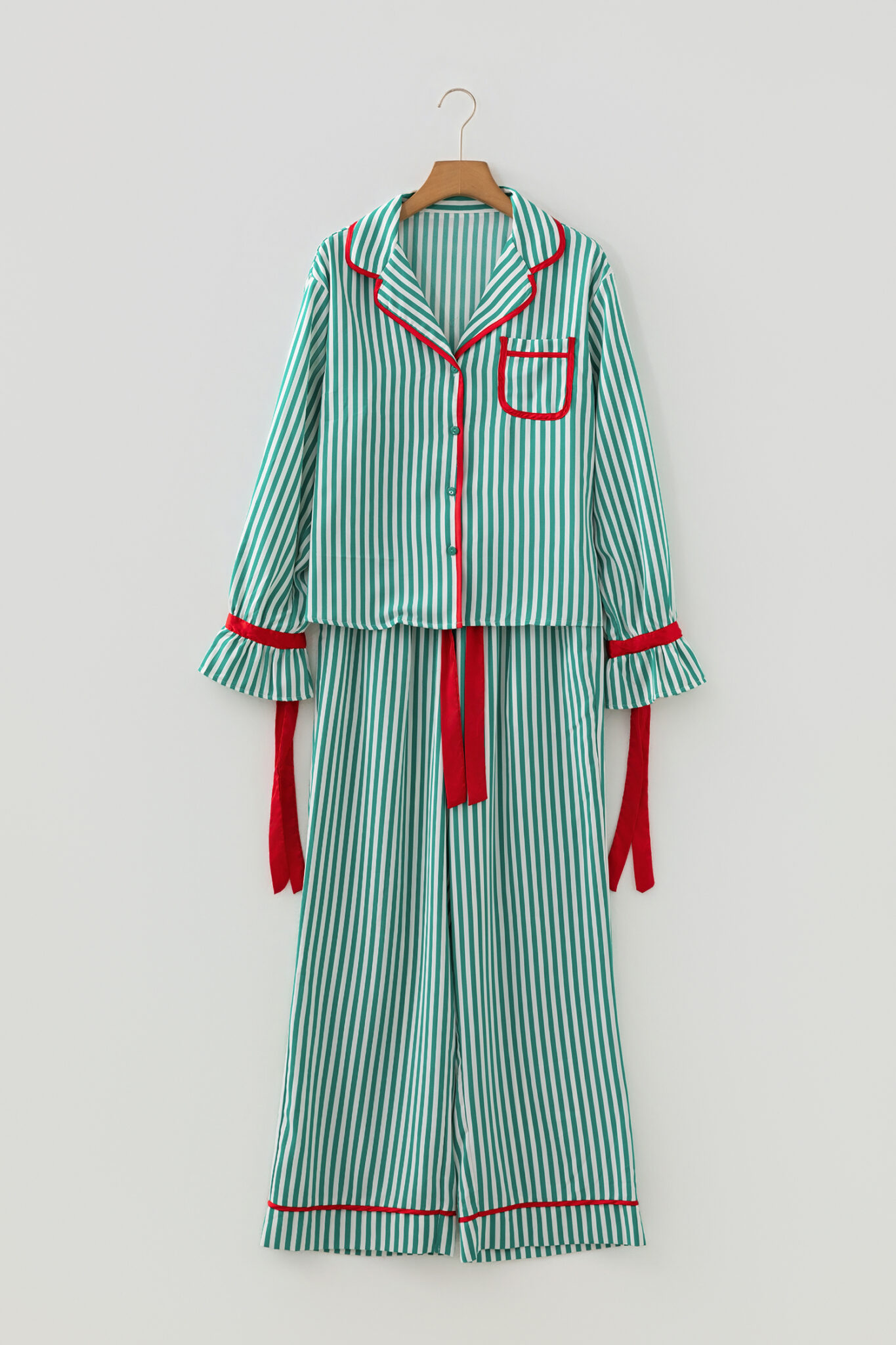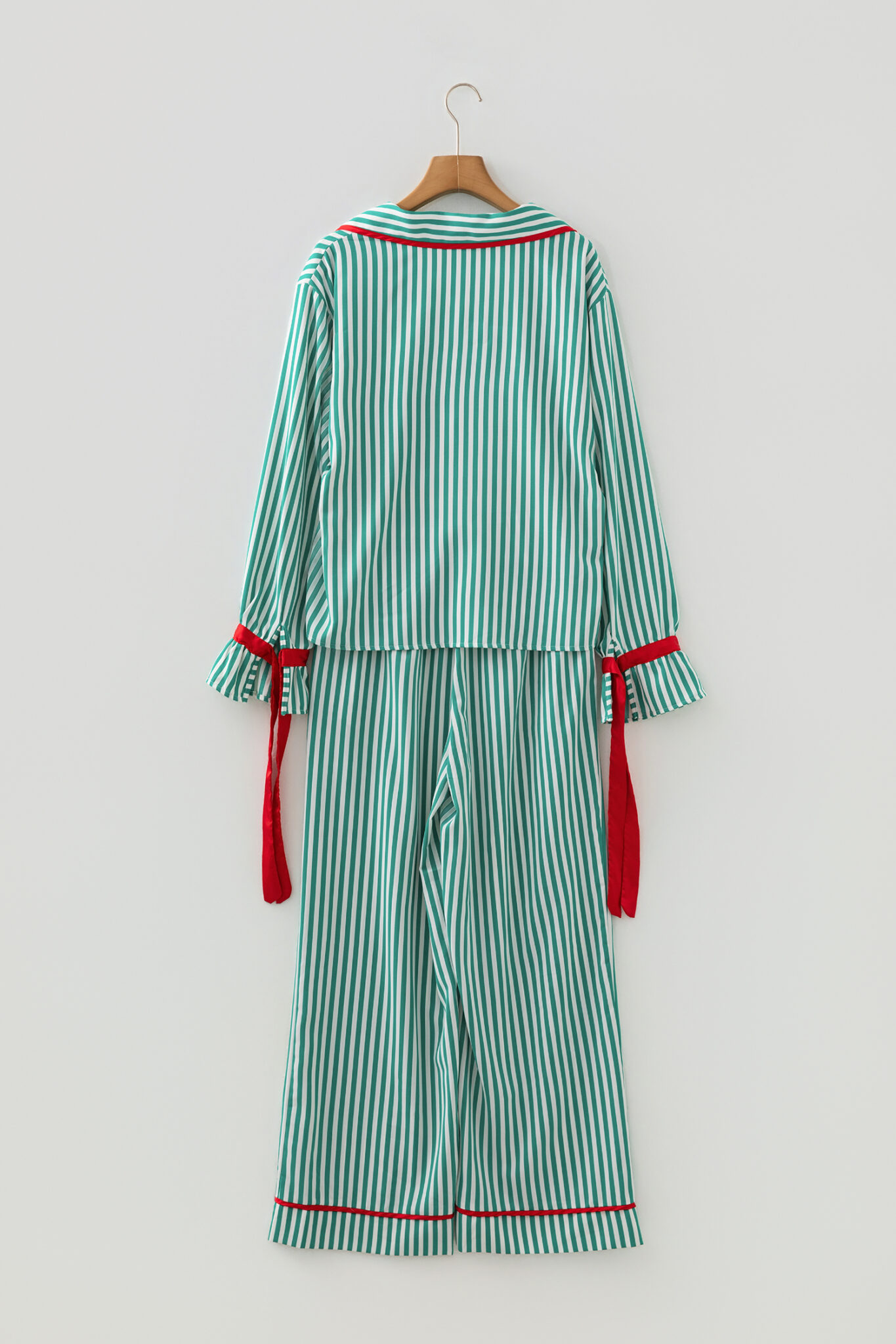 Green Stripe Contrast Velvet Trim Bow Knot Waist 2pcs Pajama Set