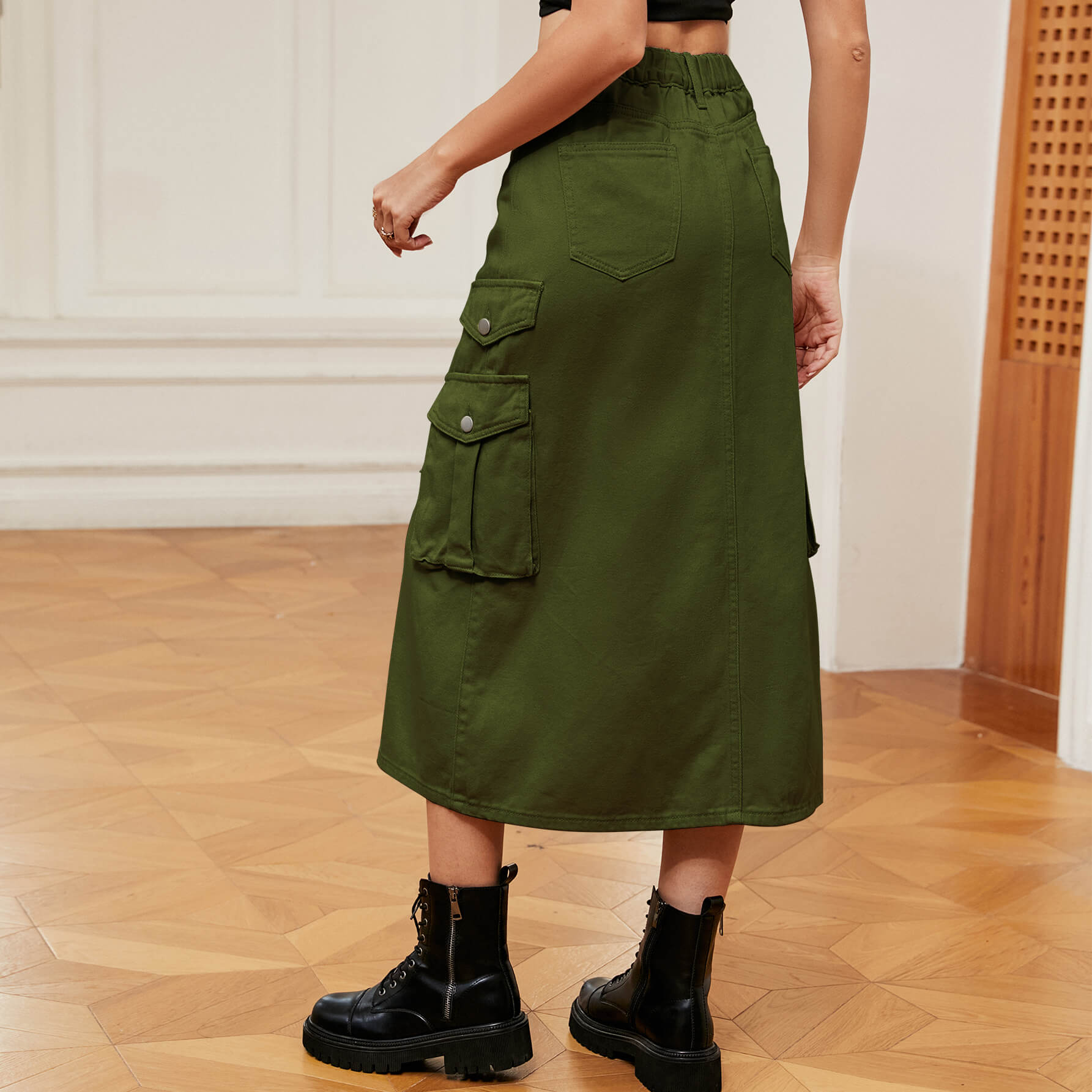 Gungle Green Color Casual Denim Cargo Midi Skirt with Dual Side Pockets