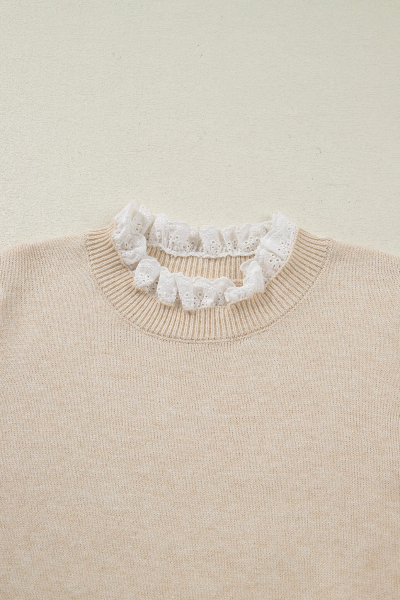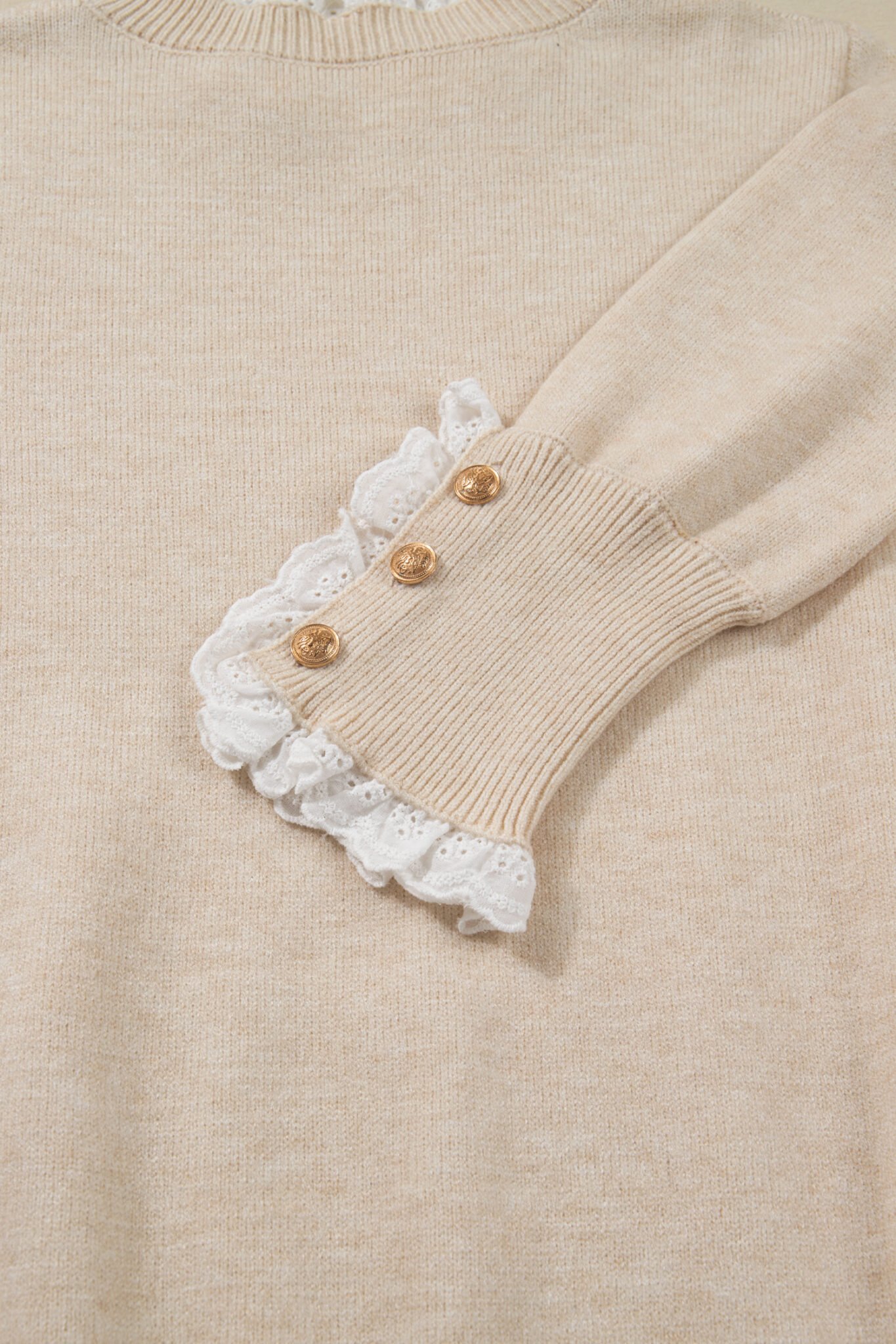 Jet Stream Lace Trim Patchwork Buttoned Cuffs Loose Sweater