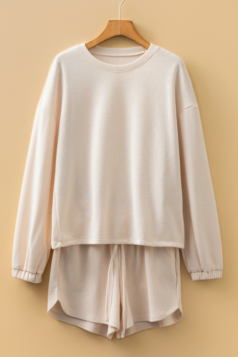 Jet Stream Solid Color Textured Knit Drop Shoulder Pullover Drawstring Shorts Set