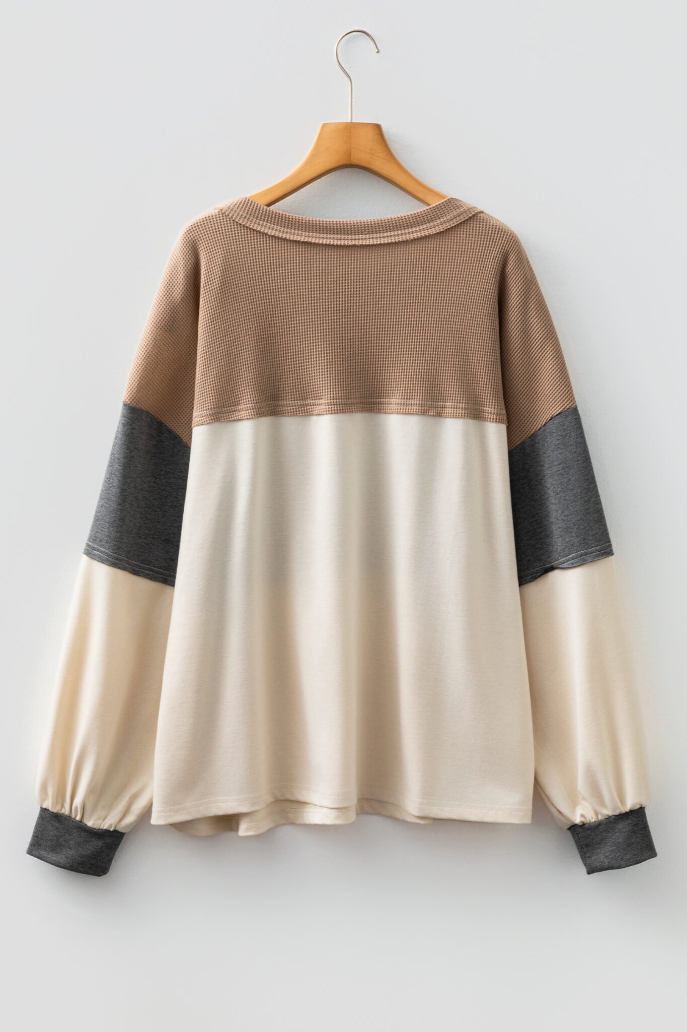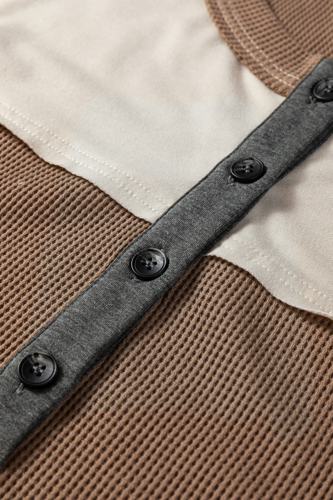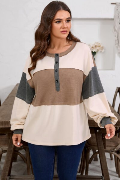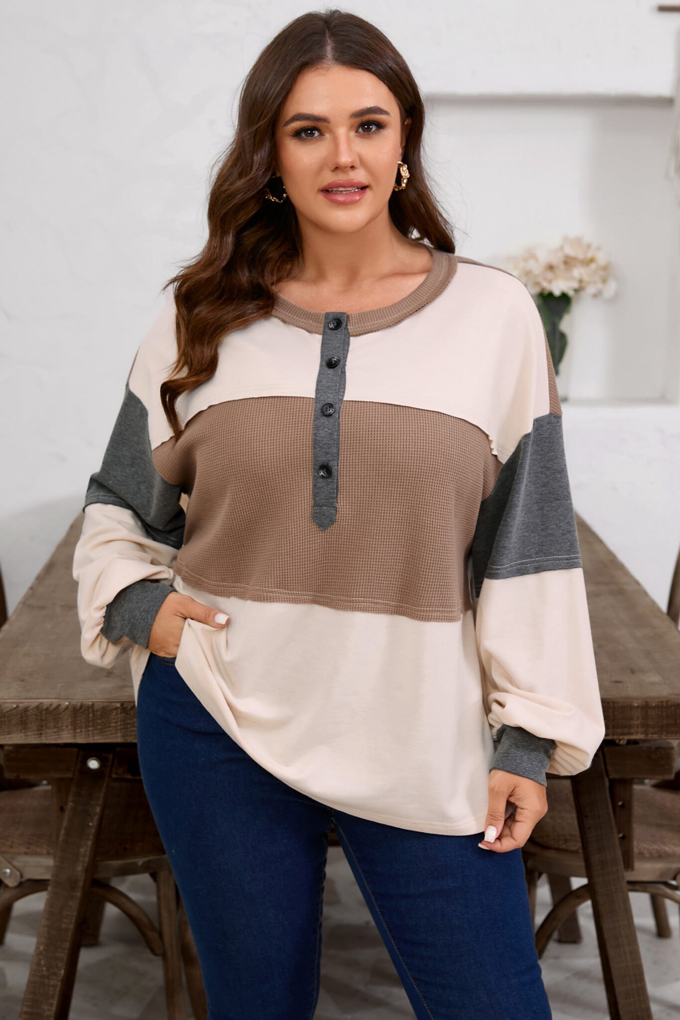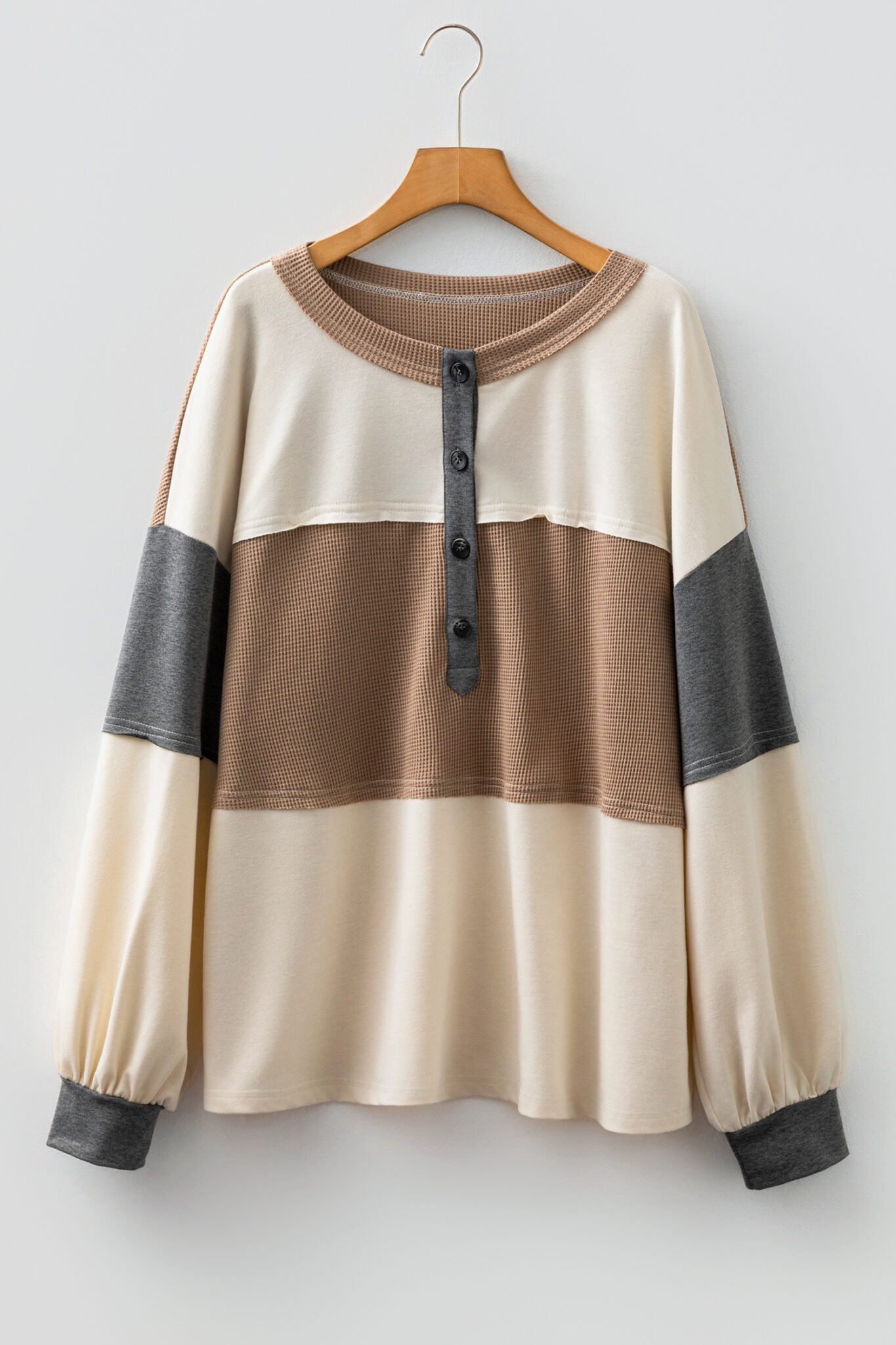 Jet Stream Waffle Patchwork Colorblock Half Buttons Casual Plus Size Knit Jumper
