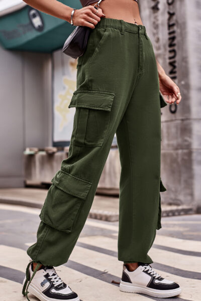 Jungle Green Color Loose Fit Drawstring Hem Denim Cargo Pants