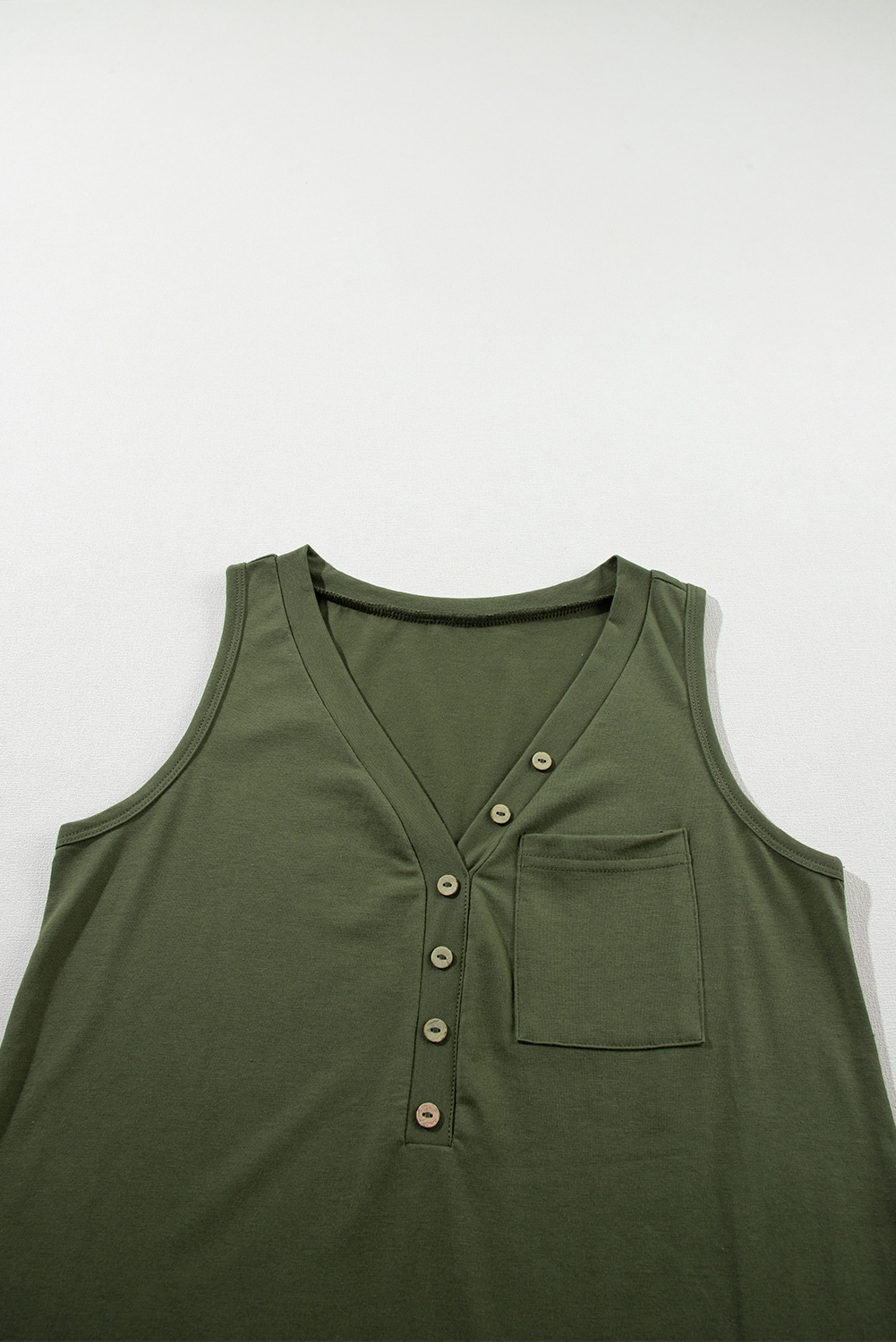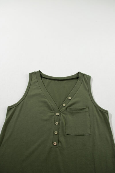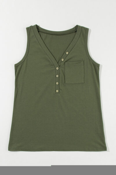 Jungle Green Half Button V Neck Patched Pocket Tank Top