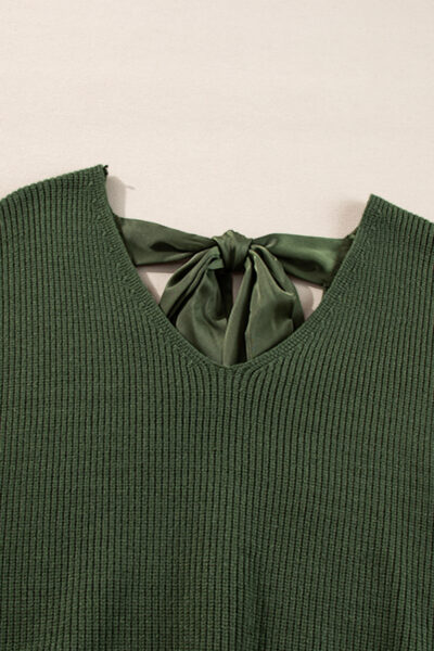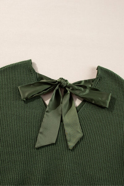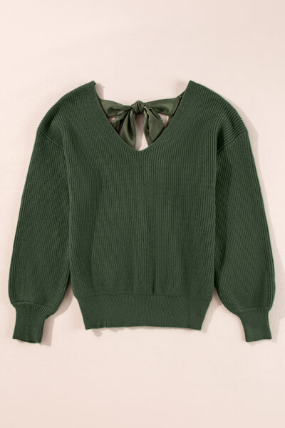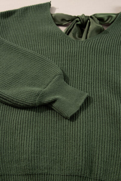 Jungle Green Lantern Sleeve V Neck Knot Back Sweater