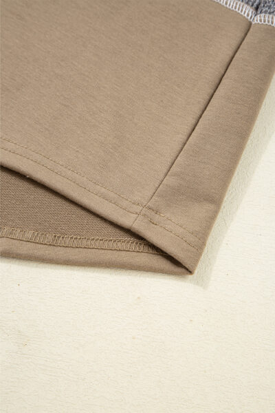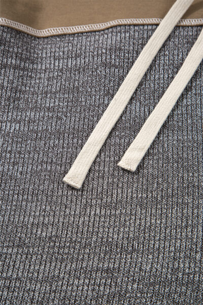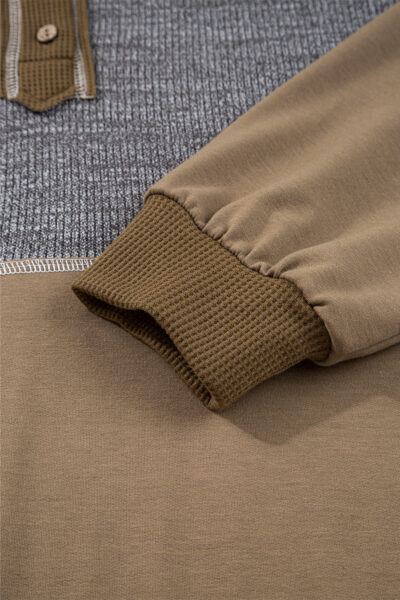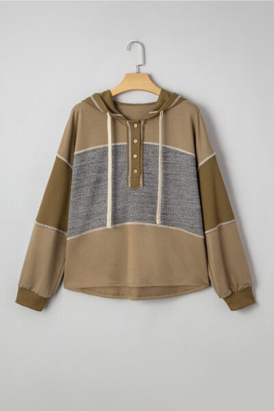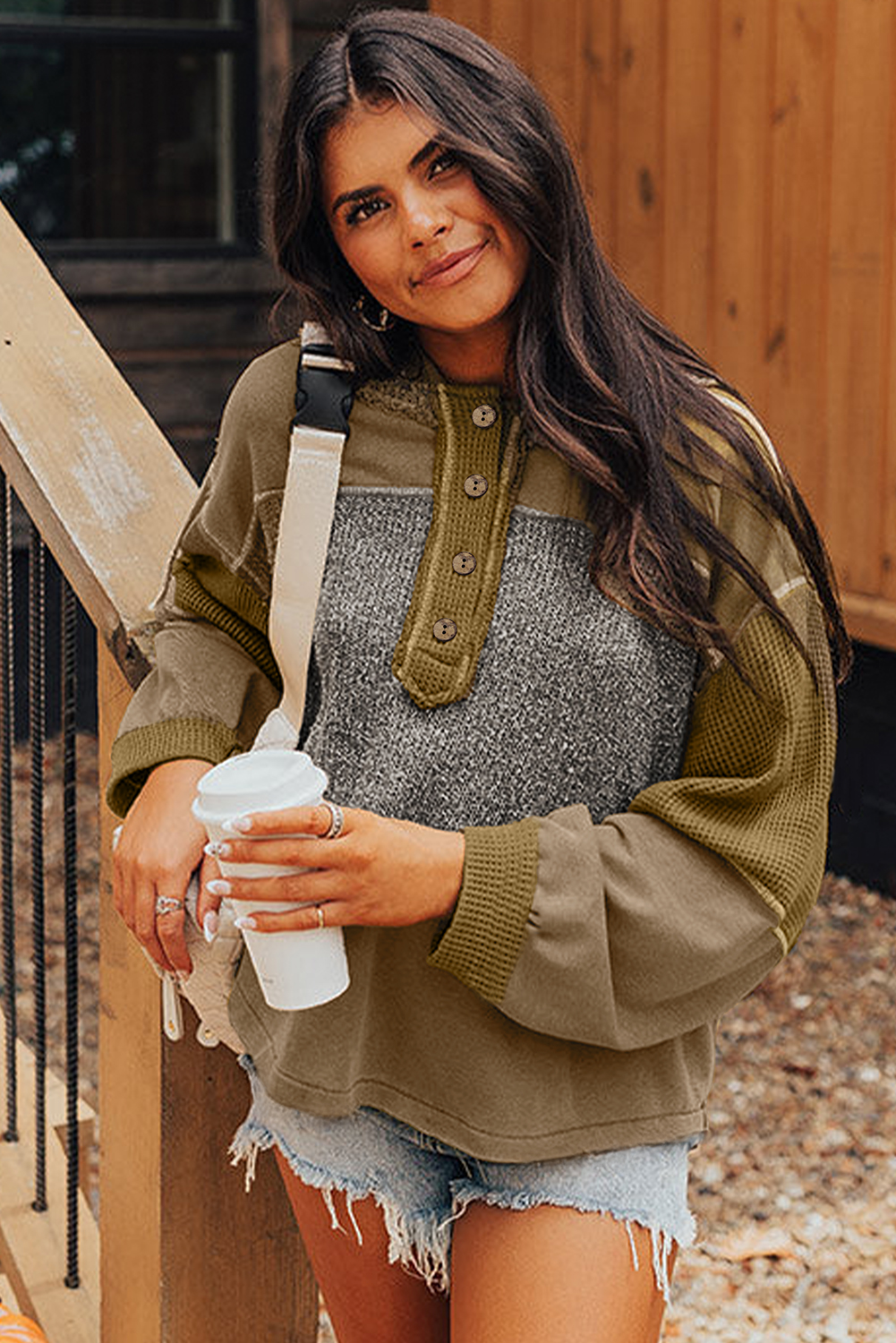 Jungle Green Mixed Texture Patchwork Exposed Seam Half Button Pullover Hooded Sweatshirt