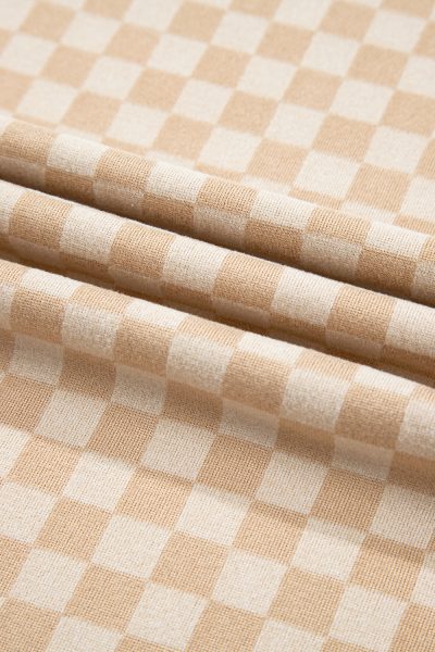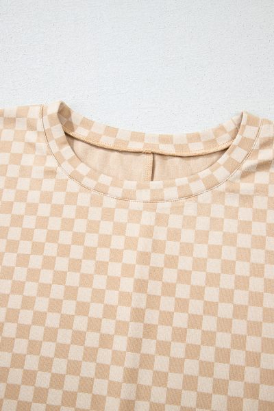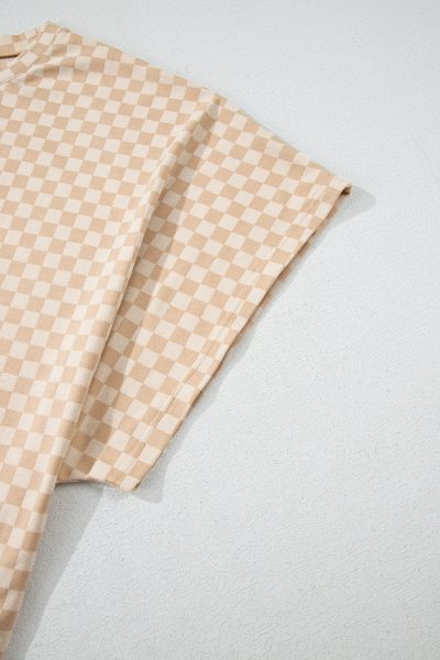 Khaki Checkerboard Short Batwing Sleeve Round Neck Plus Size T Shirt