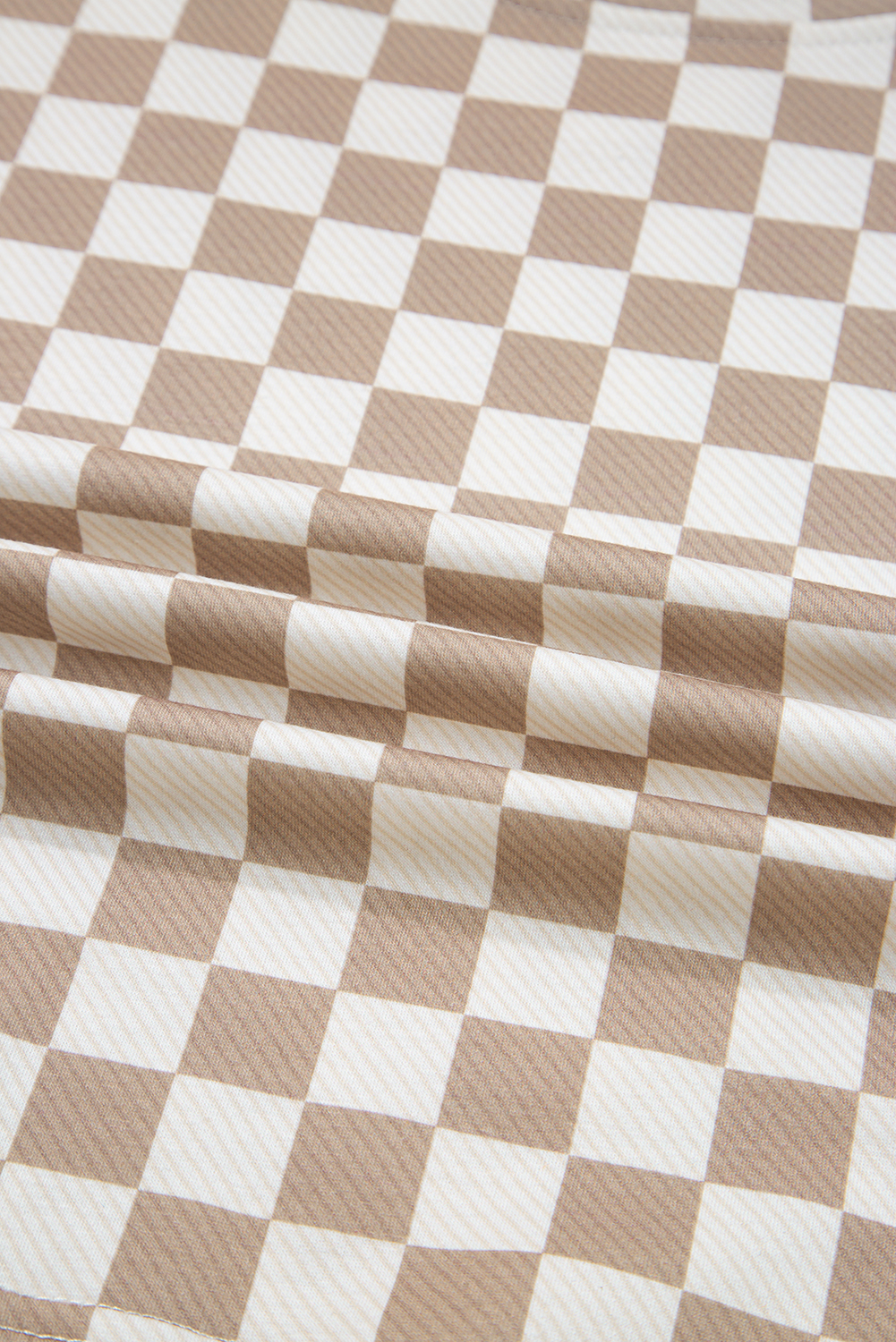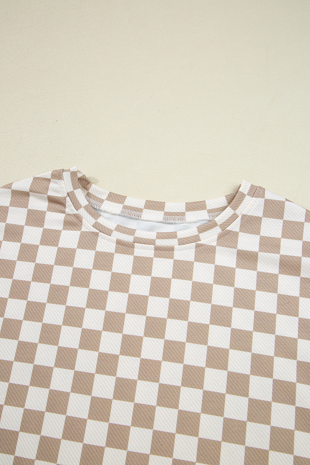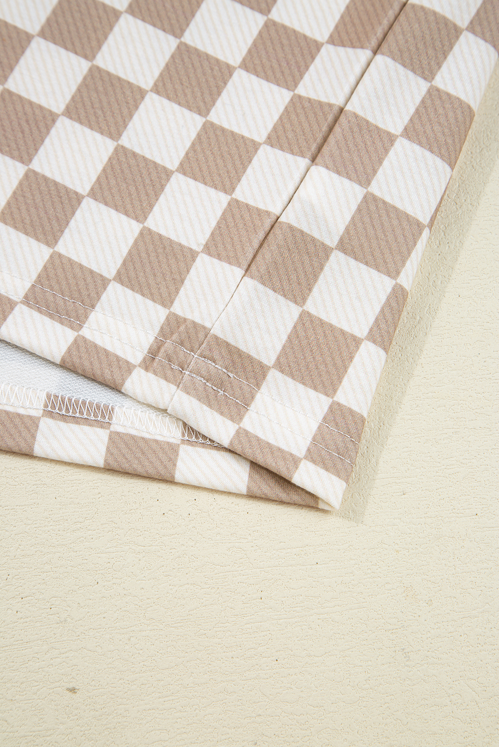 Khaki Checkered Long Sleeve Crop Top High Waist Skort 2pcs Set