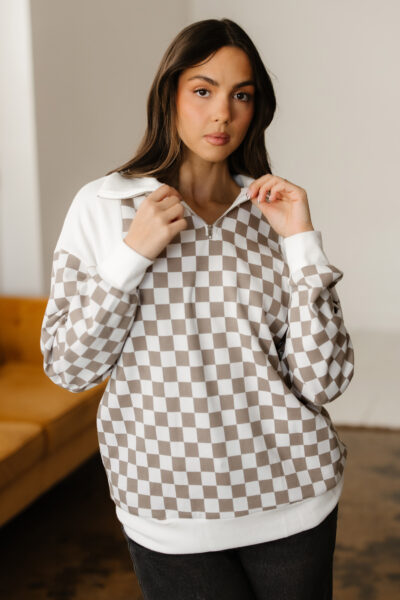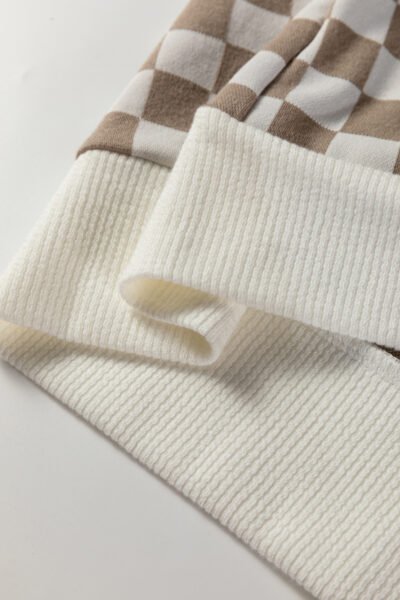 Khaki Checkered Print Quarter Zip Ribbed Patchwork Loose Sweatshirt