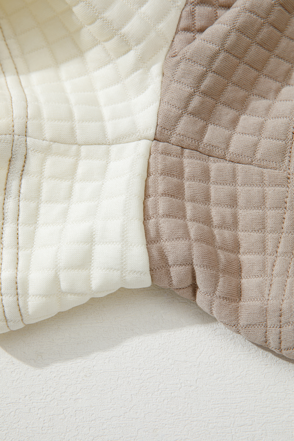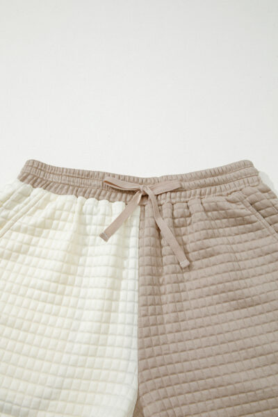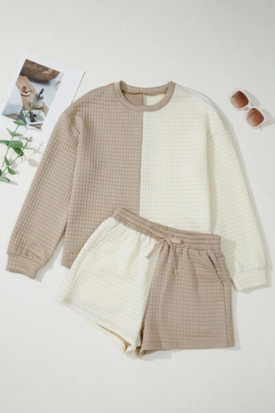 Khaki Color Block Patchwork Textured Long Sleeve Top 2pcs Short Set