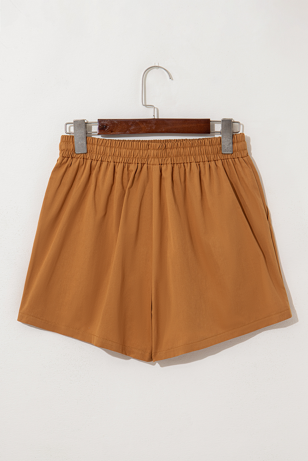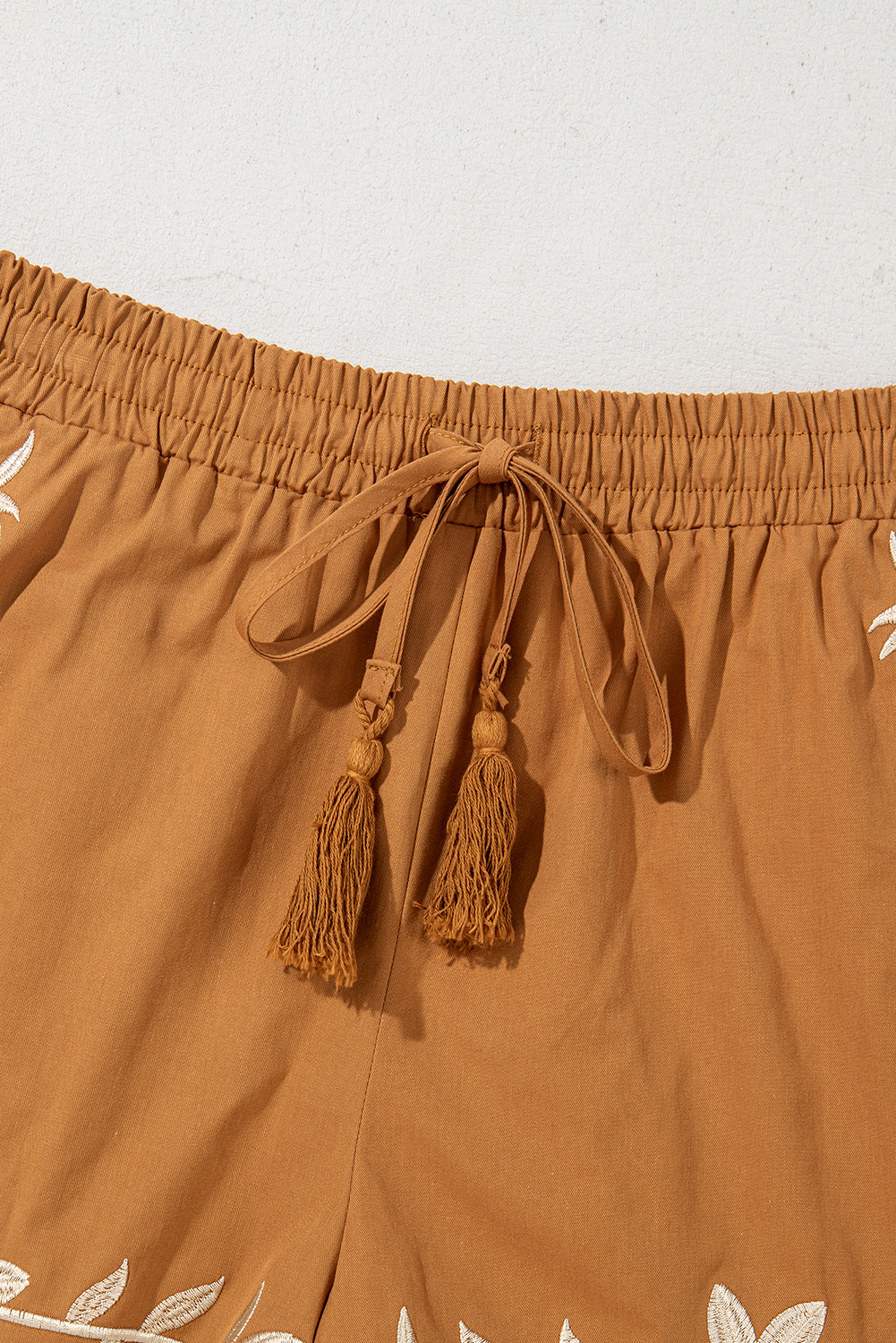 Khaki Embroidered Boho Tasseled Drawstring Elastic Waistband Casual shorts