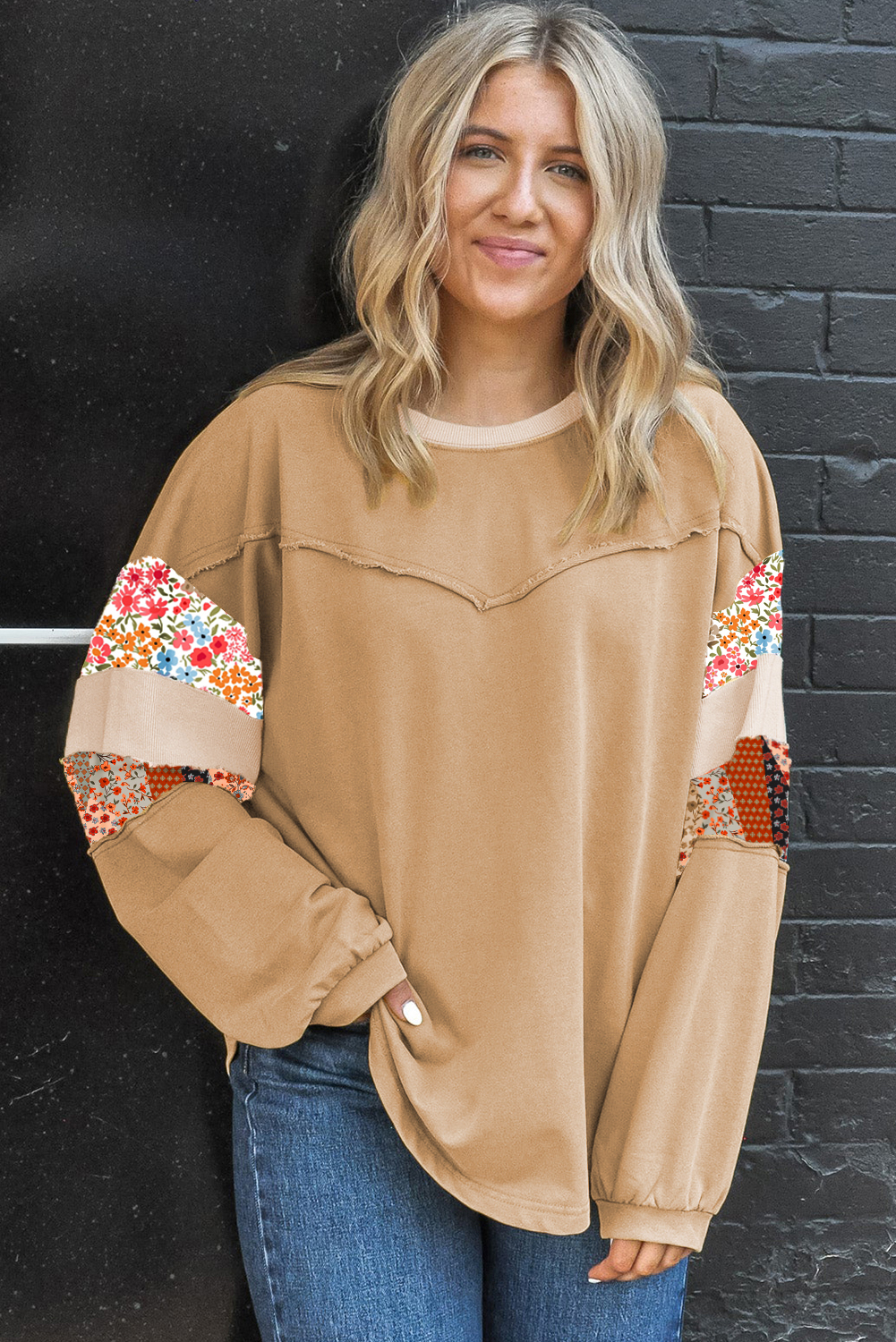 Khaki Exposed Seam Floral Mixed Patchwork Relaxed Plus Size Top