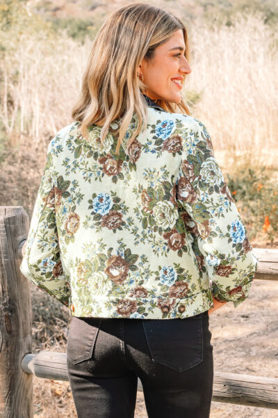Khaki Floral Print Zip Up Contrast Collared Jacket