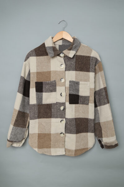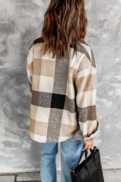 Khaki Plaid Color Block Buttoned Long Sleeve Jacket with Pocket