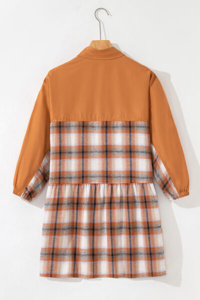 Khaki Plaid Color Block Patchwork Ruffle Hem Tunic Shirt Dress