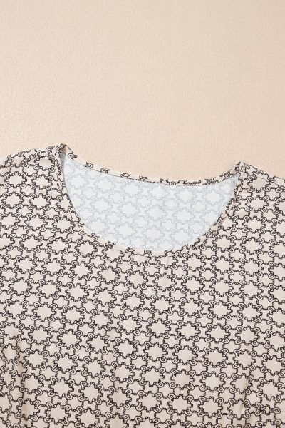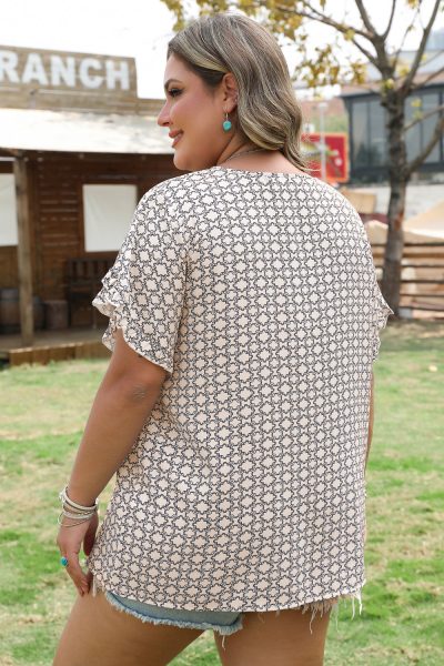 Khaki Plus Size Geometric Print Ruffled Sleeve Blouse
