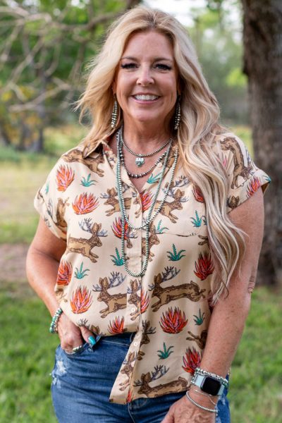 Khaki Plus Size Western Pattern Print Buttoned Short Sleeve Shirt