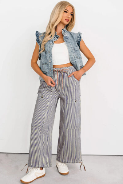 Khaki Stripe Button Patch Pocket Drawstring Elastic Waist Loose Pants