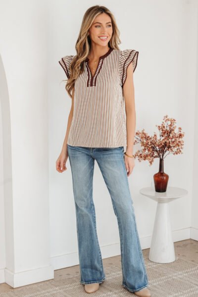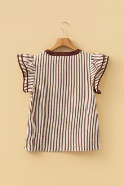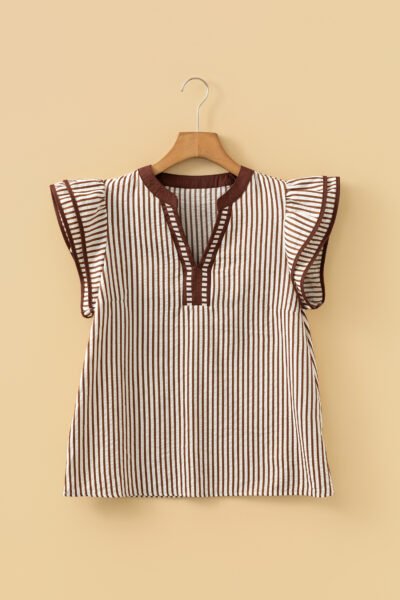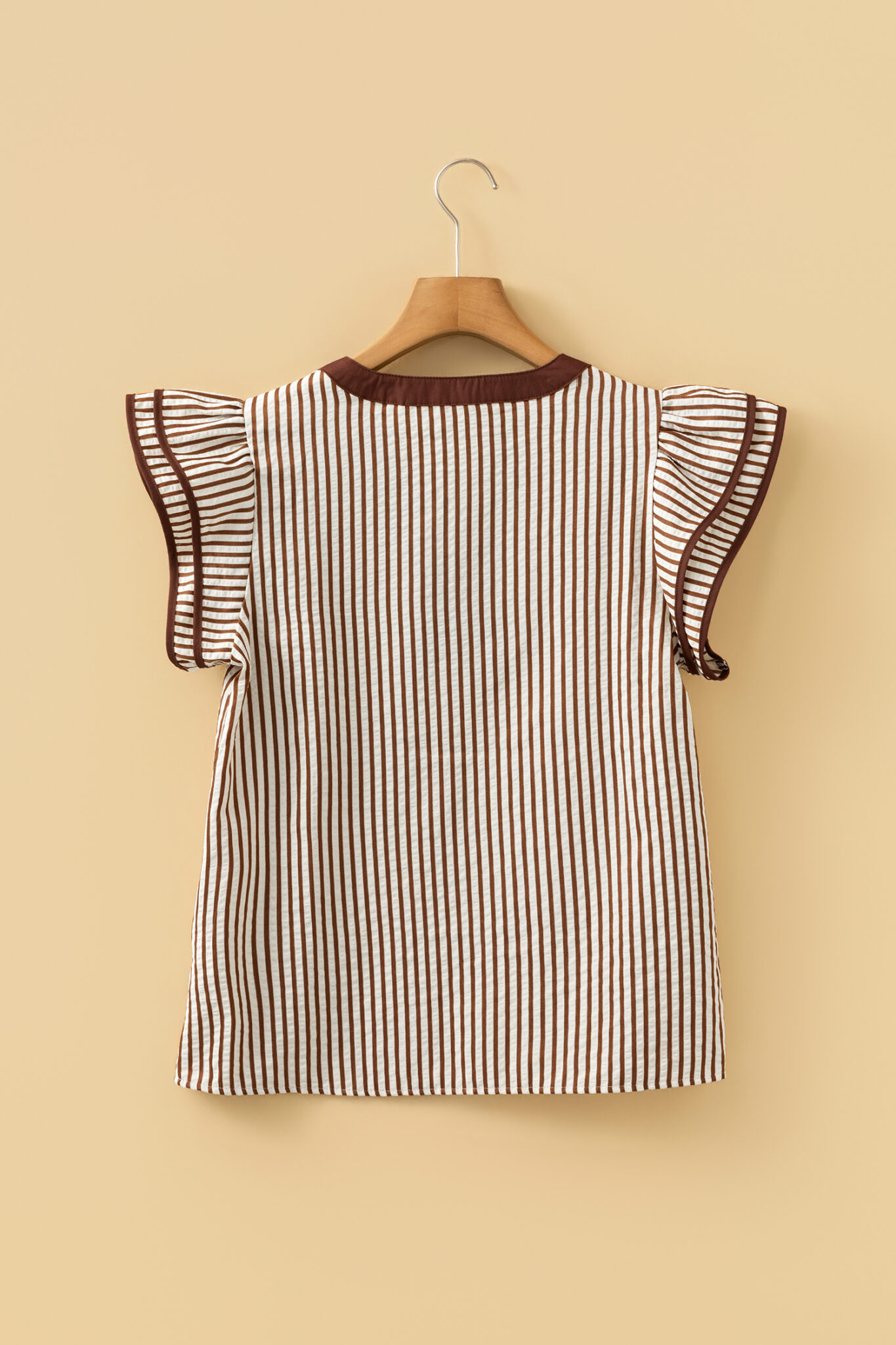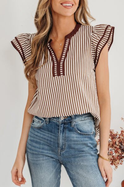 Khaki Stripe Double Ruffled Short Sleeve V Neck Blouse