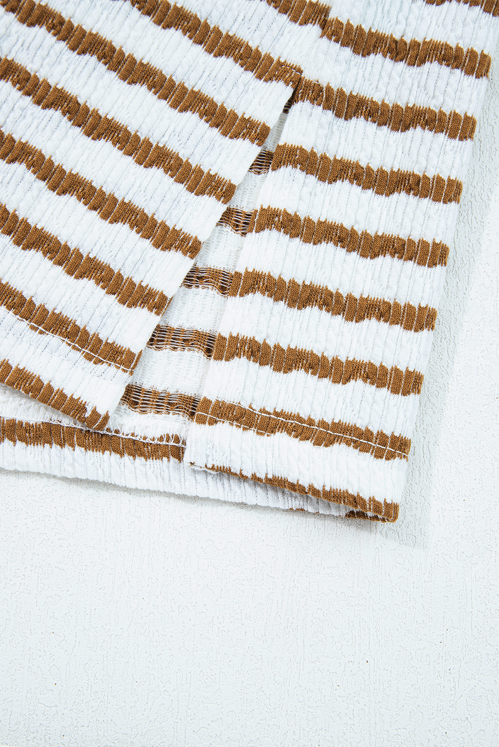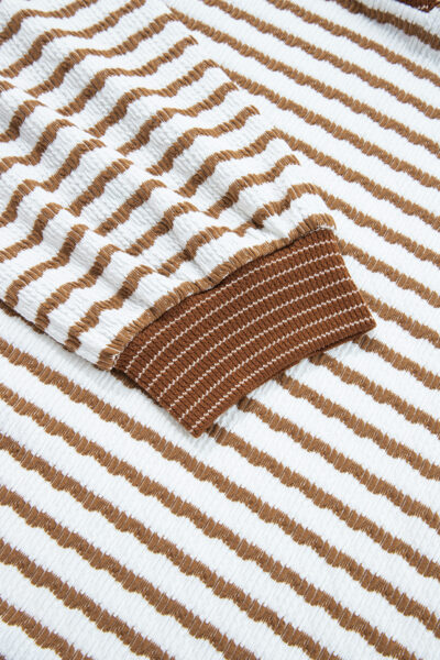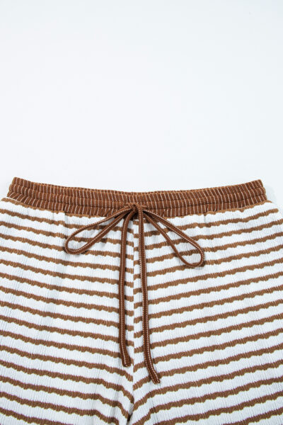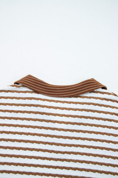 Khaki Stripe Plus Size Collared V Neck Loose Pullover Drawstring Elastic Waist Wide Leg Pant Set