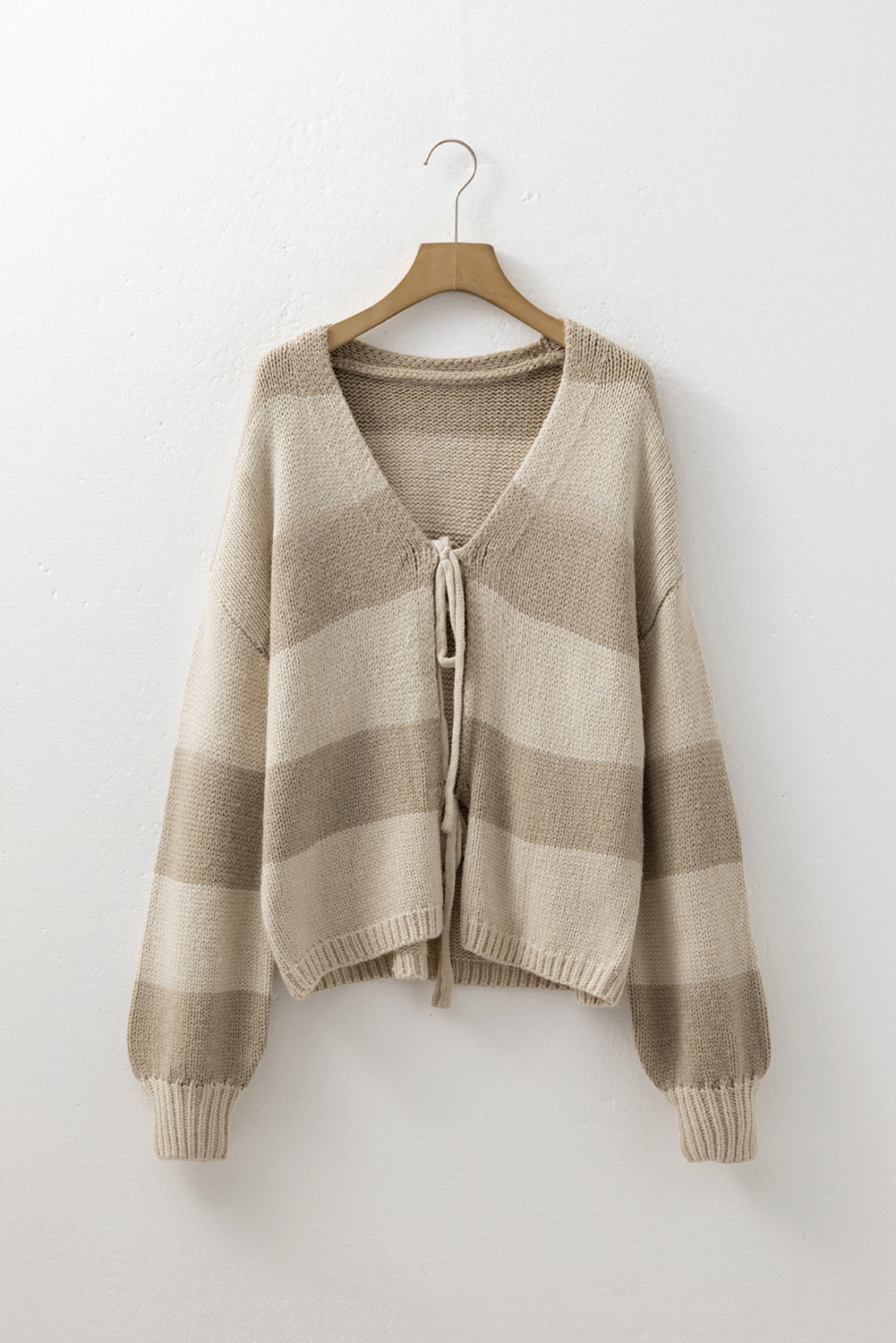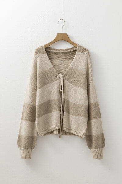 Khaki Striped Color Block Brushed Knit Bow Tie Front Sweater Cardigan