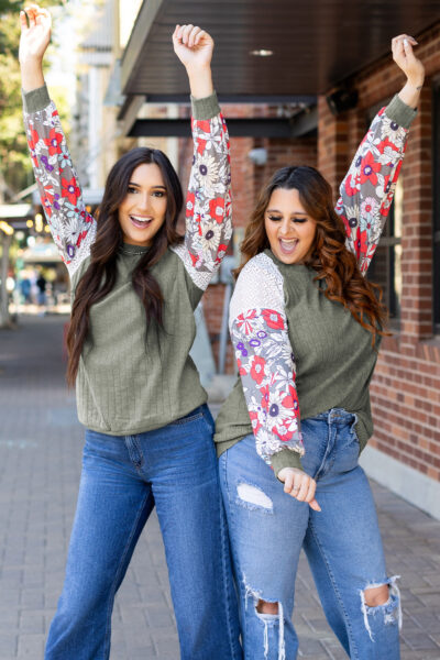 Laurel Green Floral Patchwork Long Sleeve Ribbed Blouse