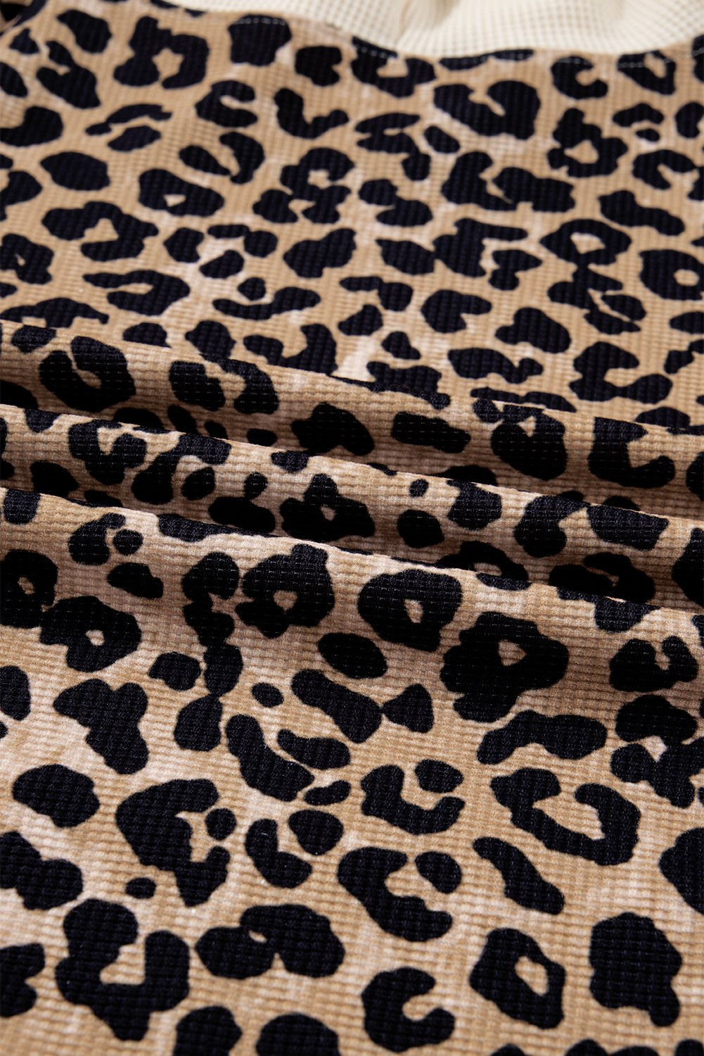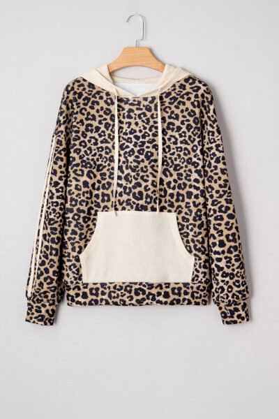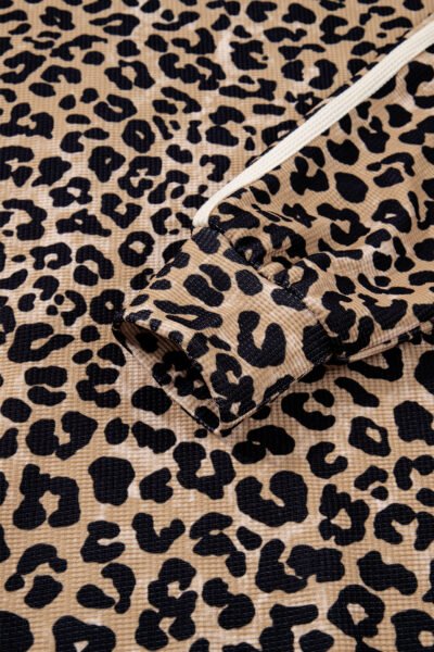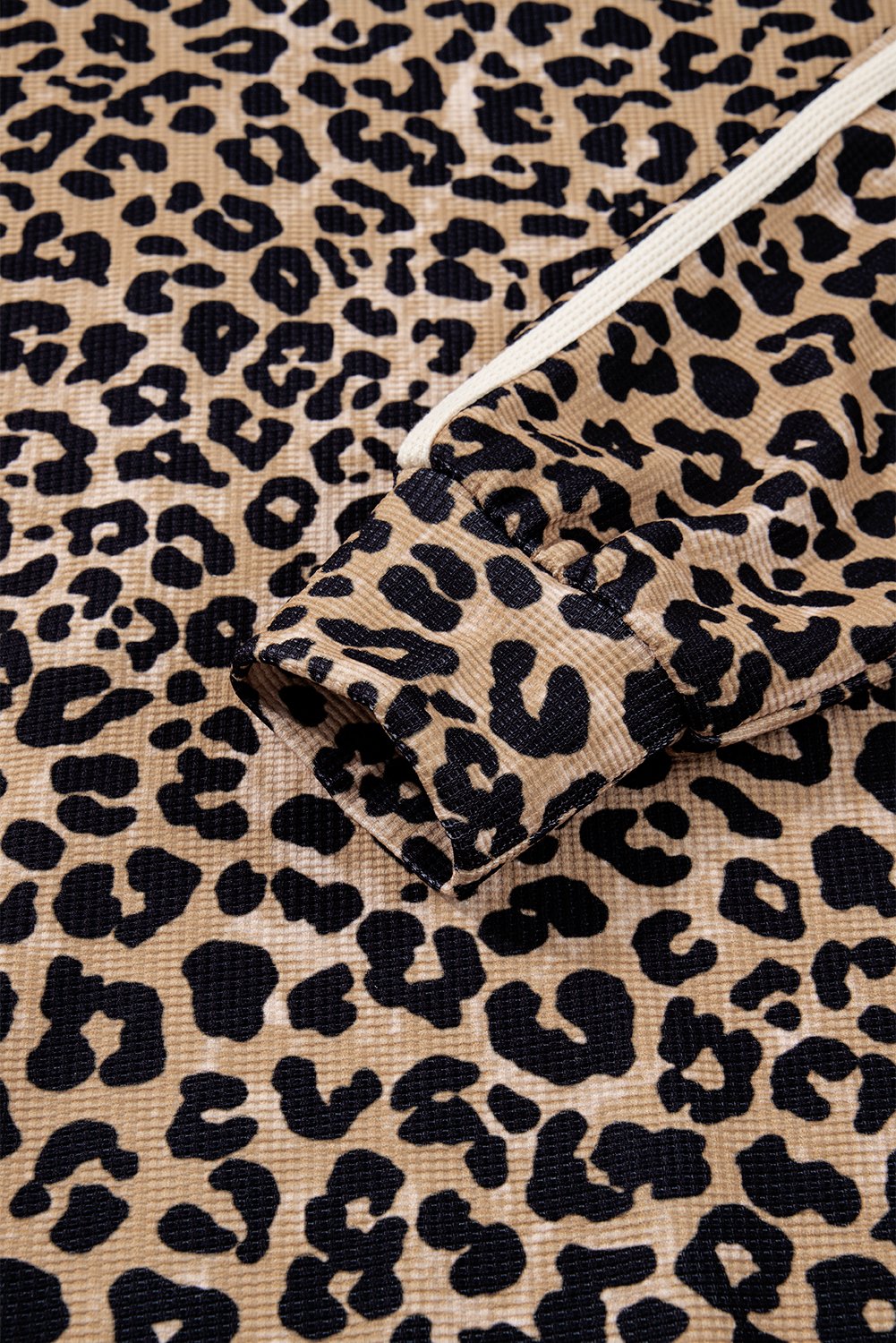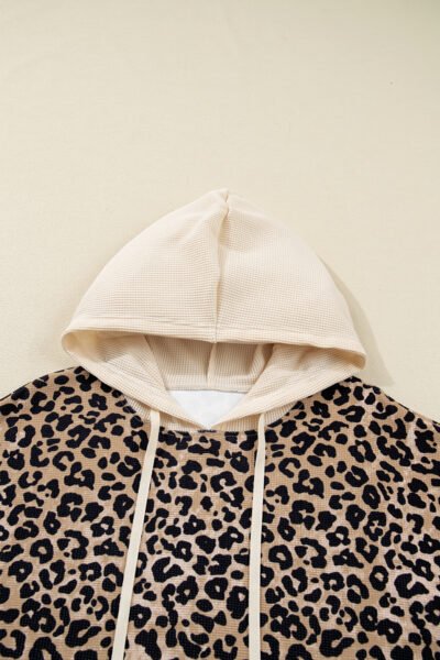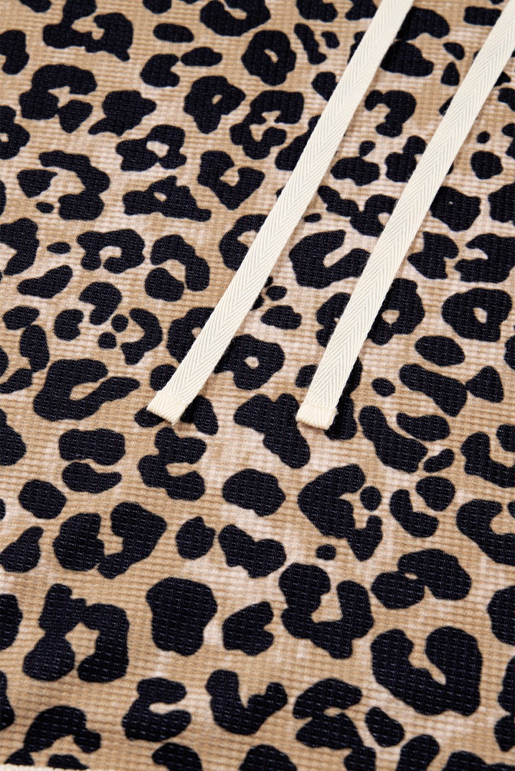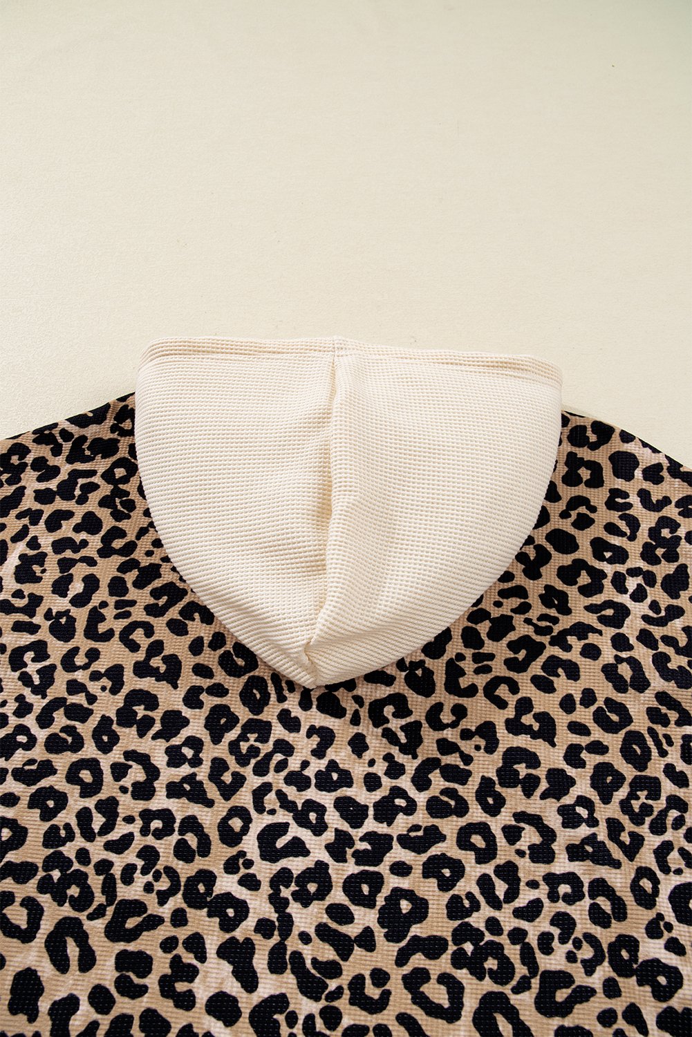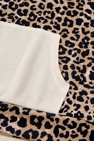 Leopard Print Waffle Contrast Kangaroo Pocket Hooded Sweatshirt