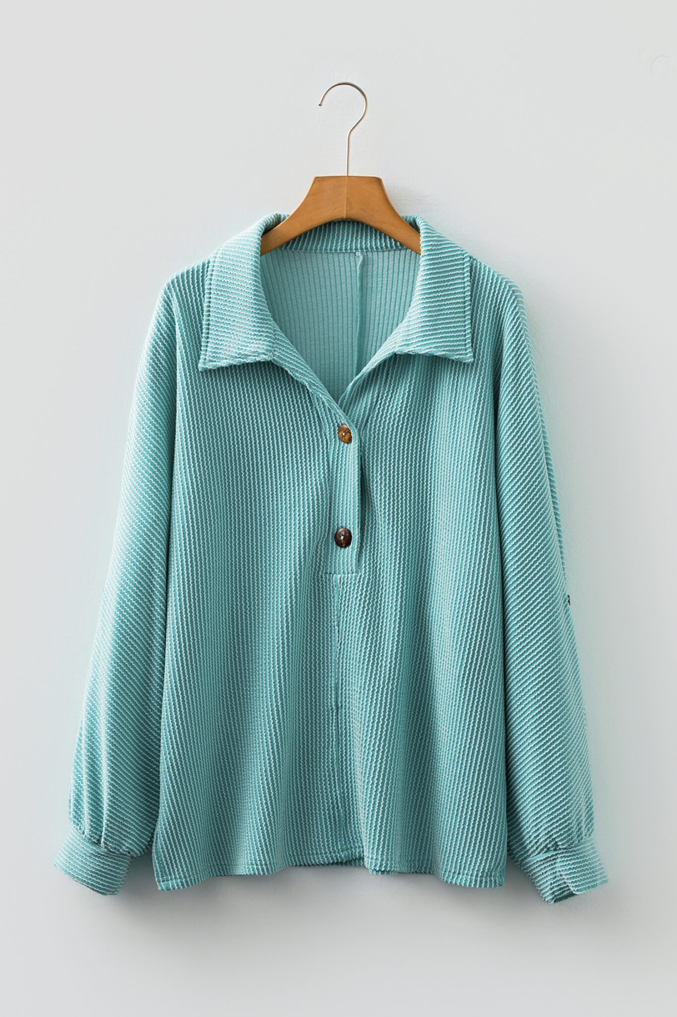 Light Blue Oversized Twist Ribbed Collared Henley Top with Roll up Sleeve