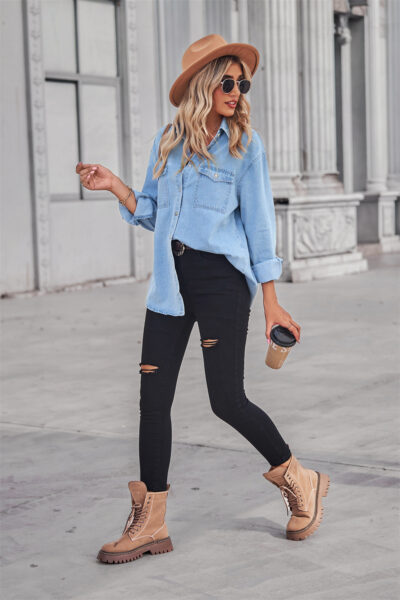 Light blue slim-fit denim long-sleeved shirt for women