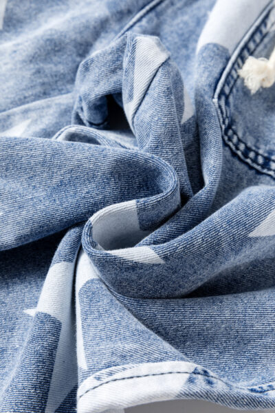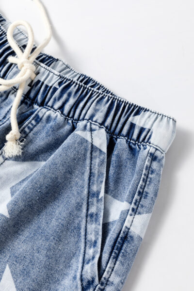 Light Blue Star Print Light Wash Drawstring Elastic Waistband Wide Leg Jeans