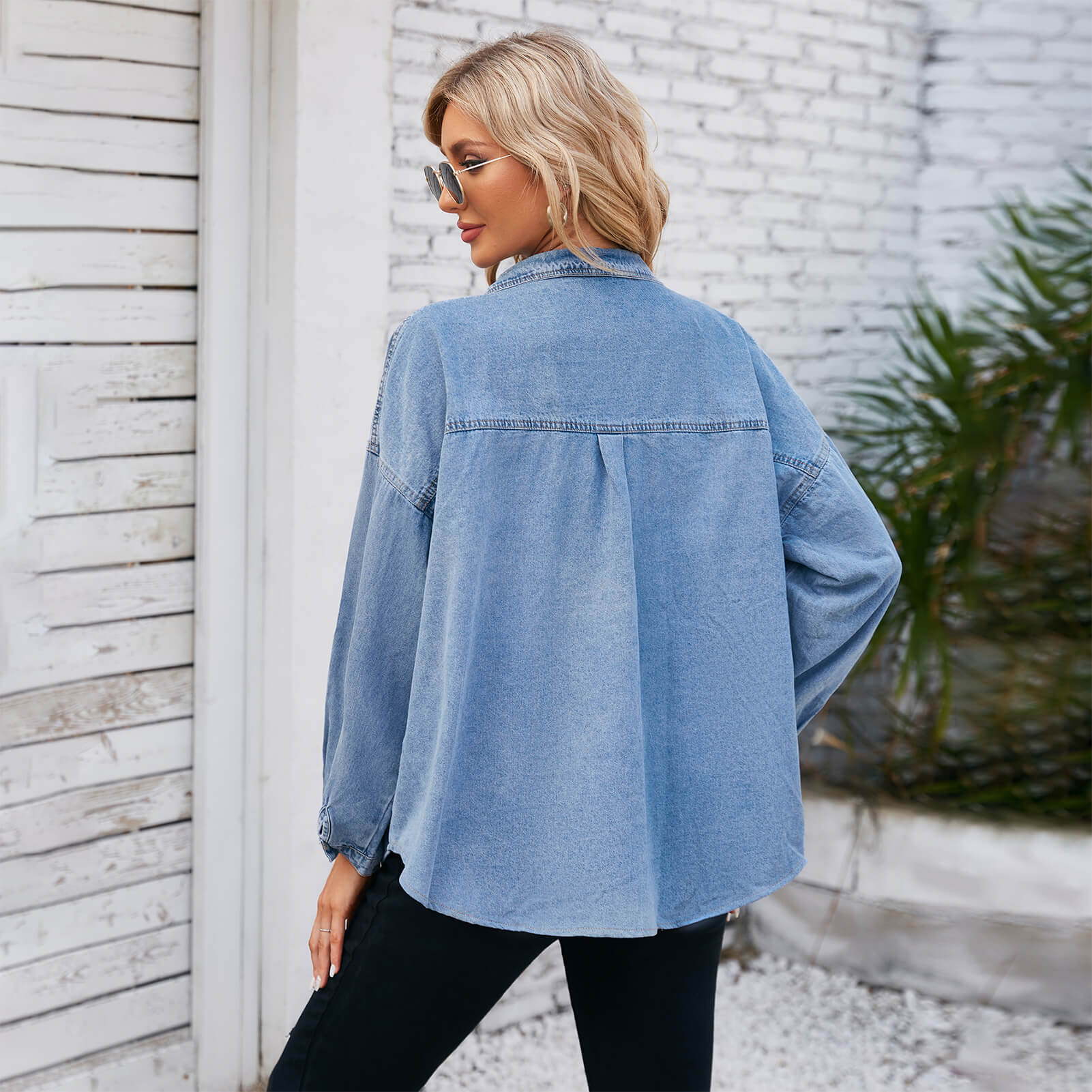 Light Blue Washed Loose-Fit Denim Top with Flap Pockets
