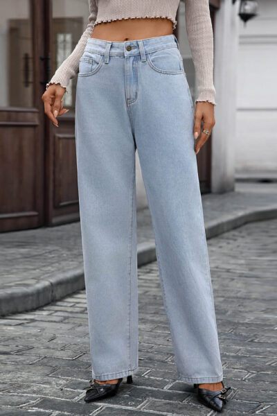 Light Blue Washed Mid Rise Straight Leg Butterfly Print Denim Jeans