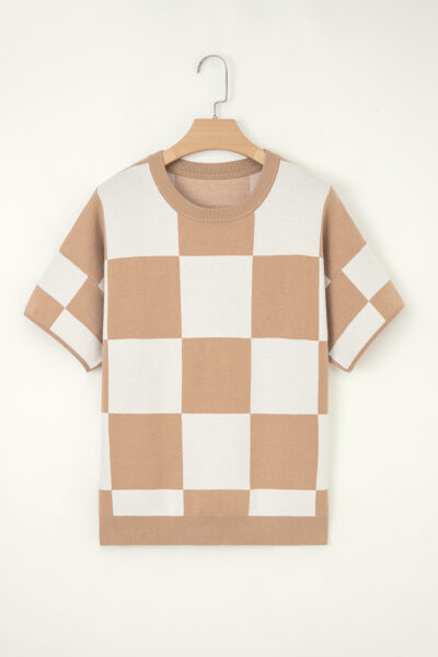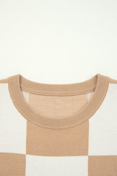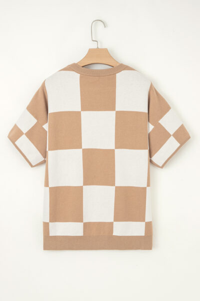 Light French Beige Checkered Pattern Loose Drop Shoulder Half Sleeve Sweater