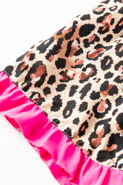 Light French Beige Leopard Print Contrast Trim Long Sleeve Shirt Drawstring Ruffle Hem Short Set