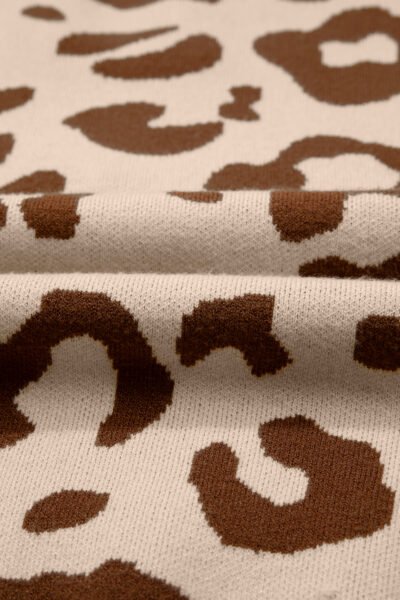 Light French Beige Leopard Printed Knit V Neck Casual Sweater