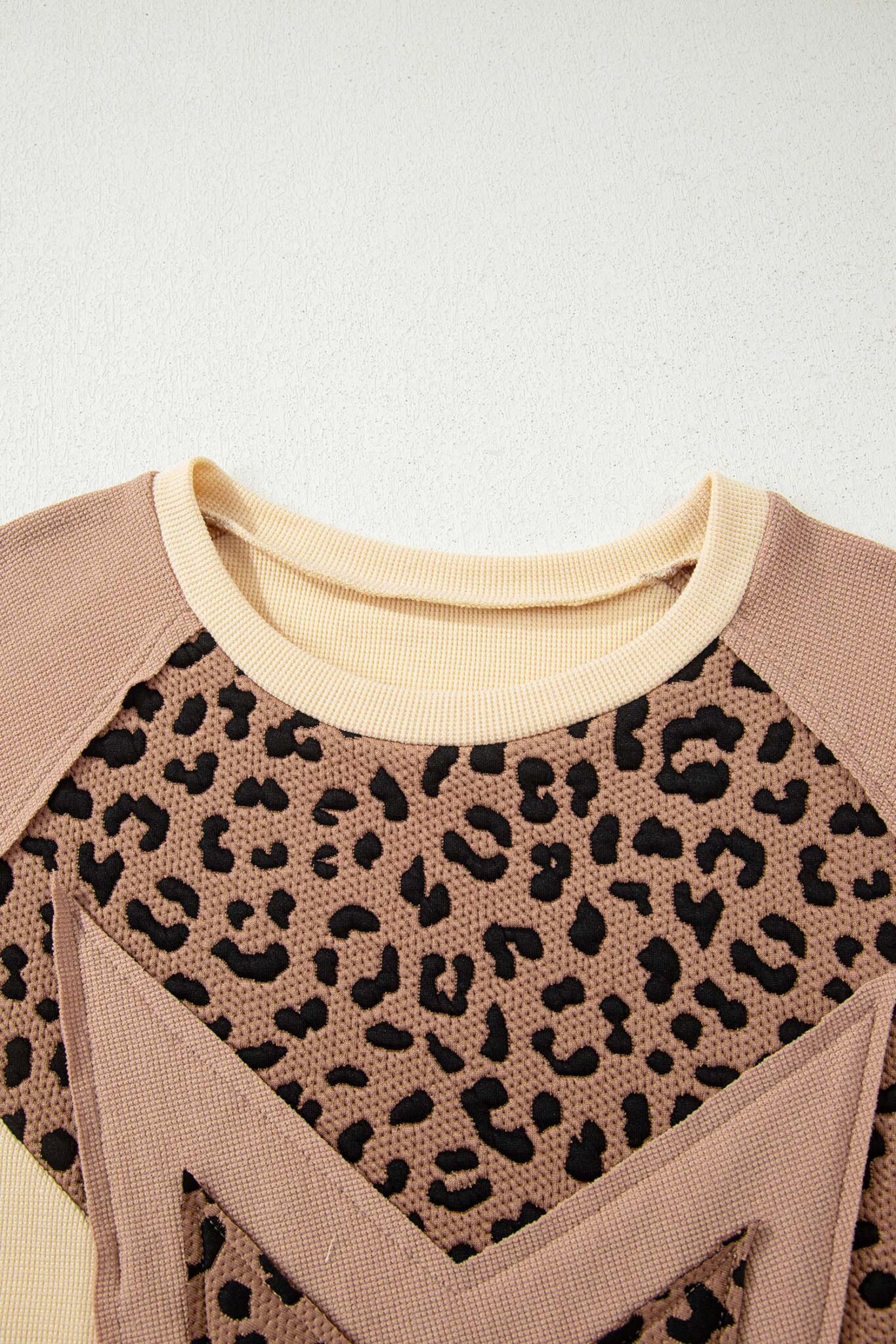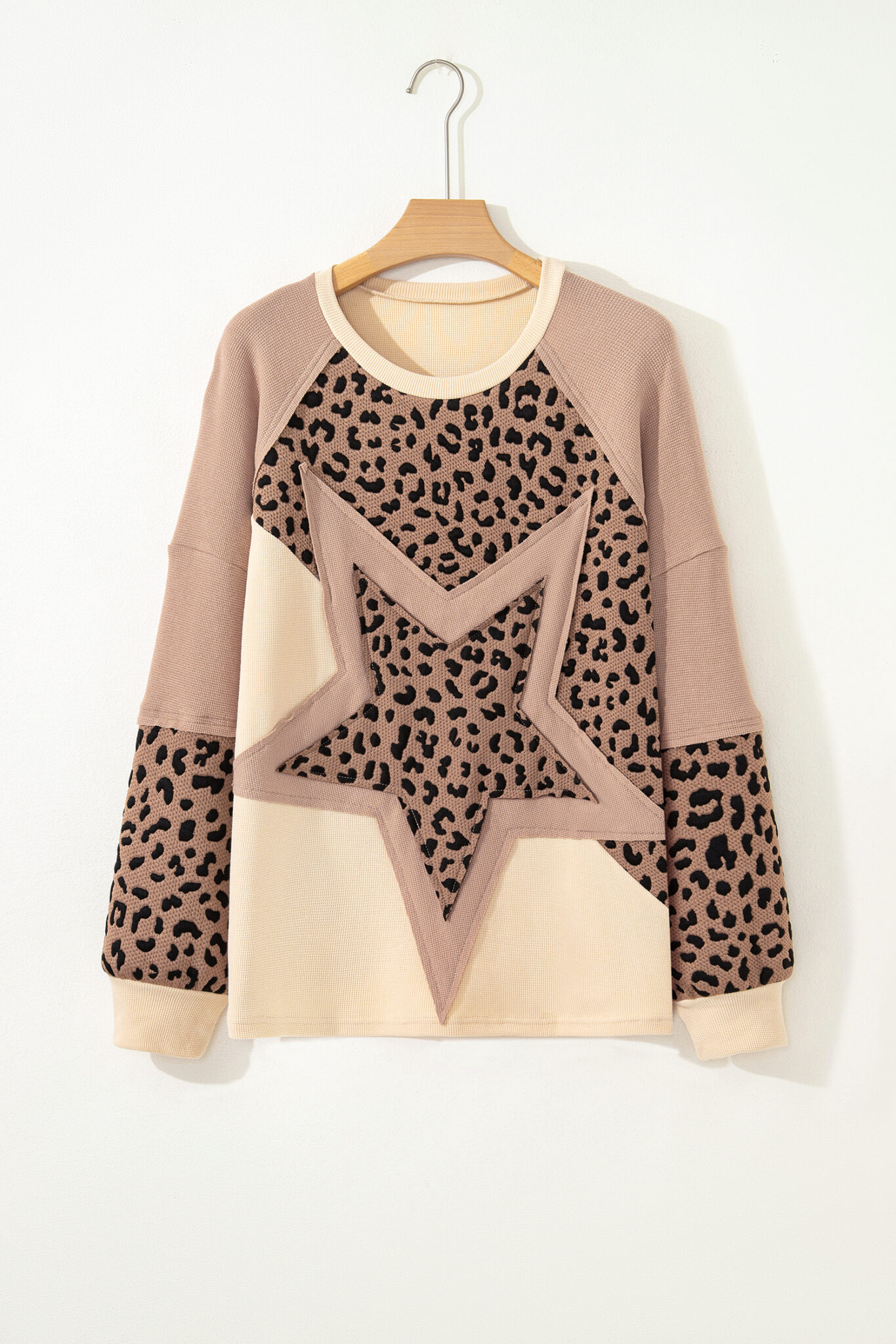 Light French Beige Leopard Star Color Block Patchwork Textured Baggy Sweatshirt