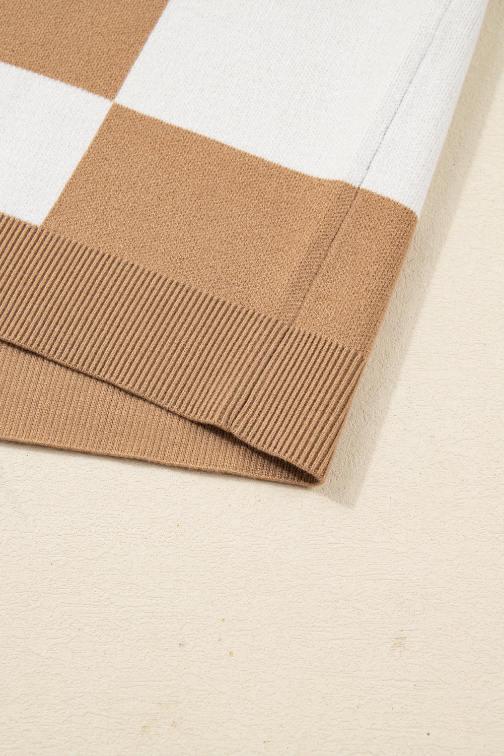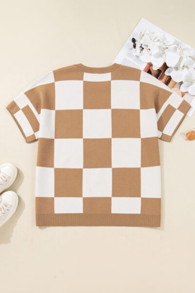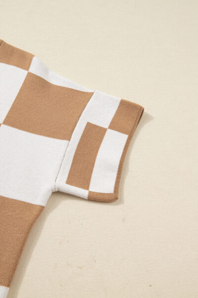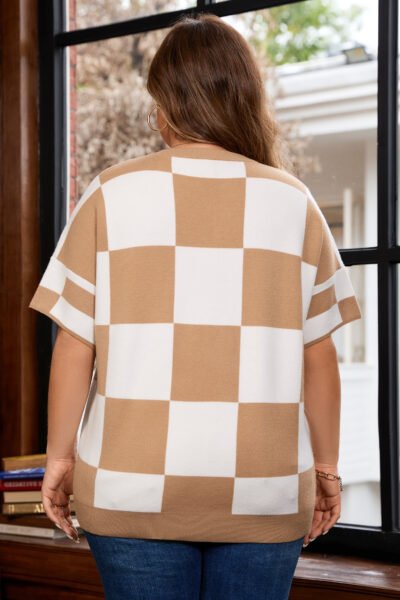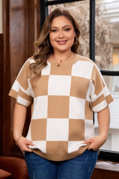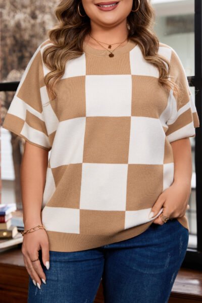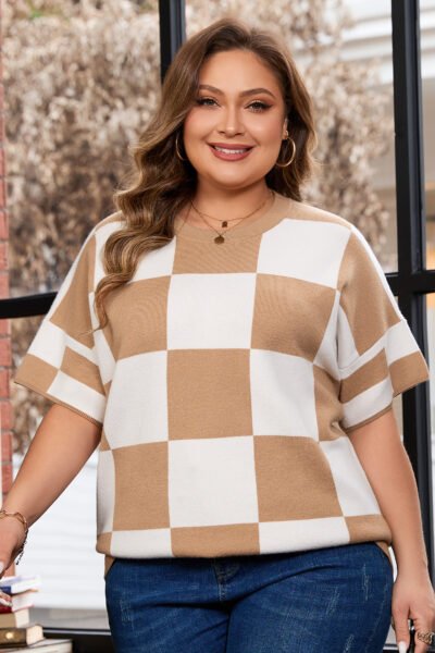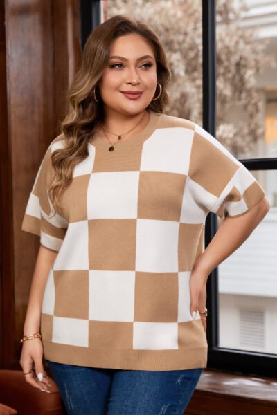 Light French Beige Plus Size Checkered Pattern Knit Short Sleeve Sweater