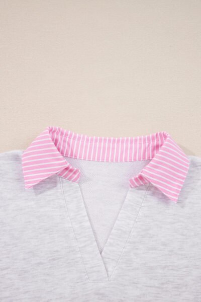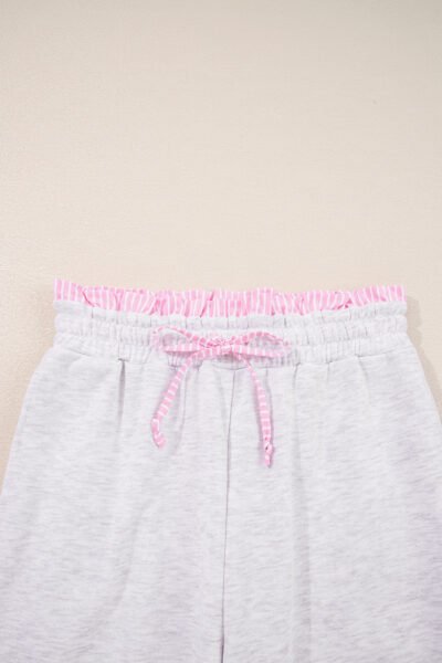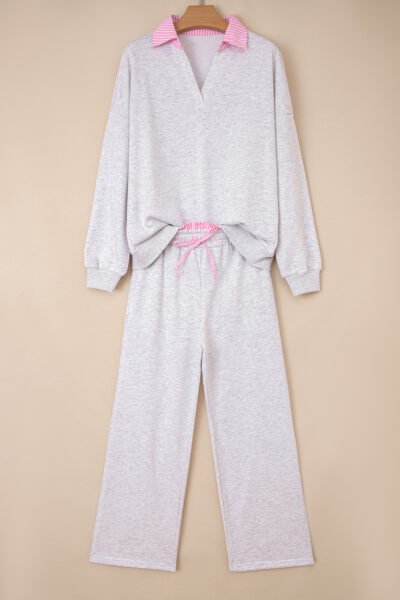 Light Grey 2pcs Contrasted Trim Frilled Collar Drop Shoulder Pullover Drawstring Pant Set