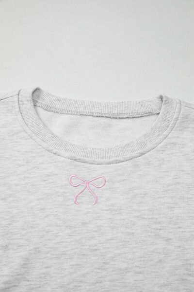 Light Grey Girly Bow Embroidered Detail Puff Sleeve Pullover 2pcs Short Set