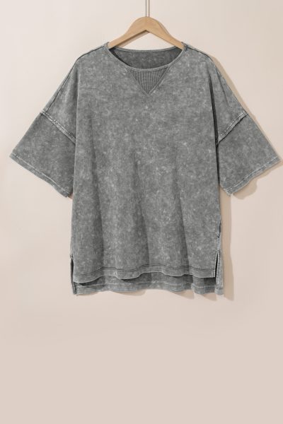 Light Grey Mineral Wash Drop Sleeve Patchwork Plus Tee